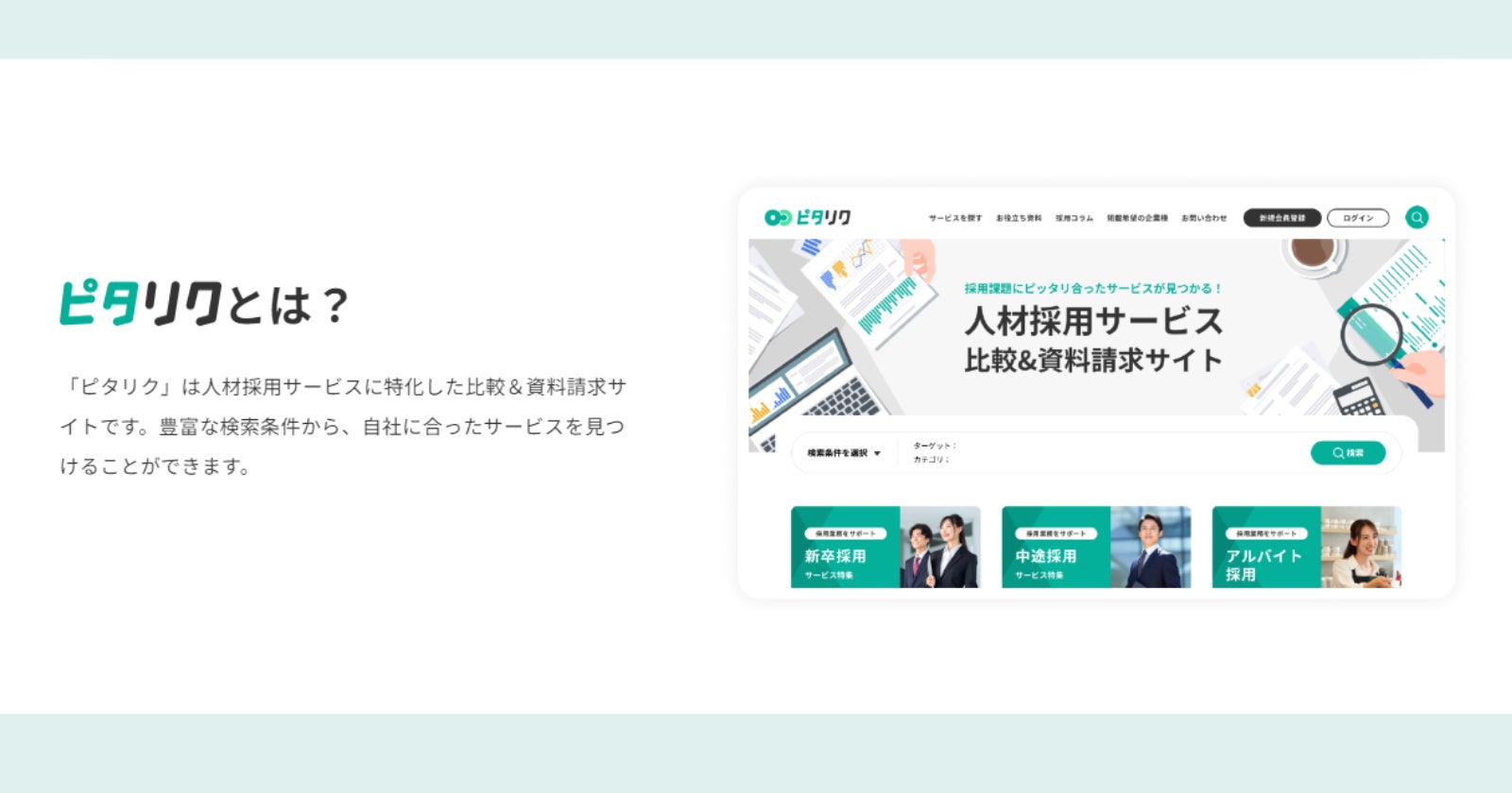 「ピタリク」は人材採用サービスに特化した比較&資料請求サイトです。豊富な検索条件から、採用課題に合ったサービスを見つけることができます。
