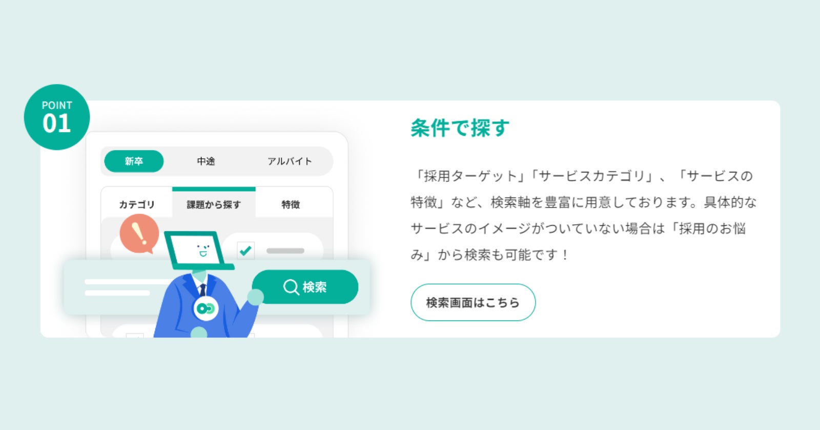 「採用ターゲット」「サービスカテゴリ」「サービスの特徴」など、検索軸を豊富に用意しております。具体的なサービスのイメージがついていない場合は「採用のお悩み」から検索も可能です!