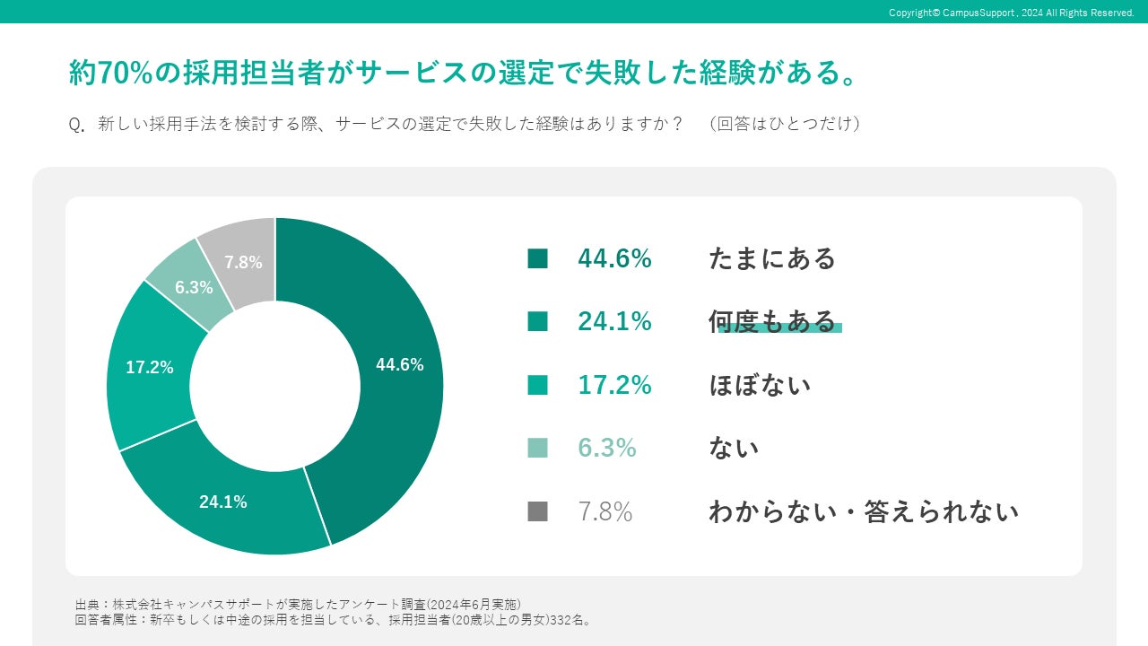 弊社が独自に行った調査では、サービス選定で失敗した経験のある採用担当者は全体の約70%となっており。その内、24.1%は何度も失敗したことがあると回答しています。