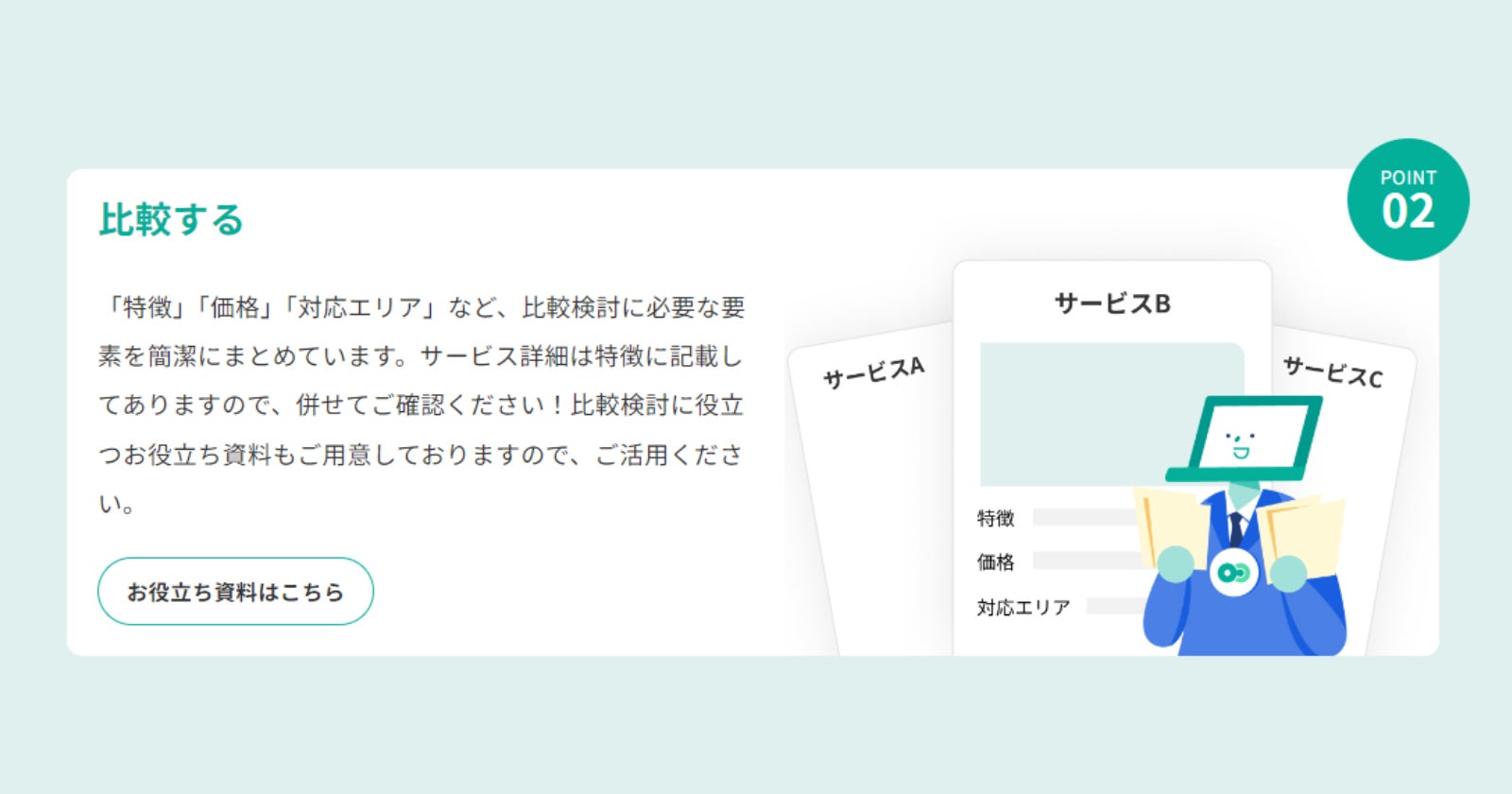 「特徴」「価格」「対応エリア」など、比較検討に必要な要素を簡潔にまとめています。サービス詳細は特徴に記載してありますので、併せてご確認ください!比較検討に役立つお役立ち資料もご用意しておりますので、ご活用ください。