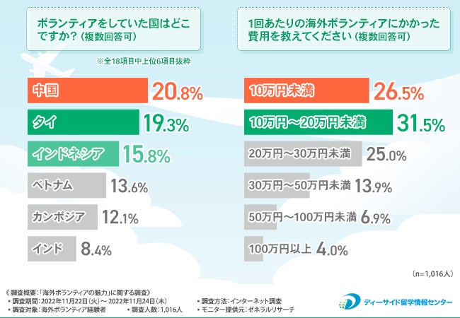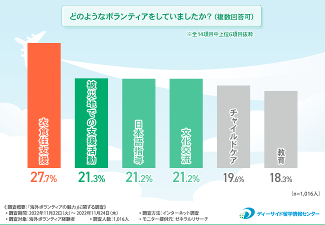 そこで今回、海外留学支援事業を行っている『ディーサイド留学情報センター(商号:株式会社アットワールド)(https://www.highschool-world.com)』は、海外ボランティア経験者を対象に、「海外ボランティアの魅力」に関する調査を実施しました。