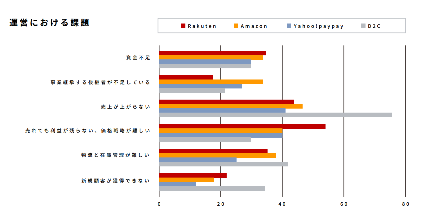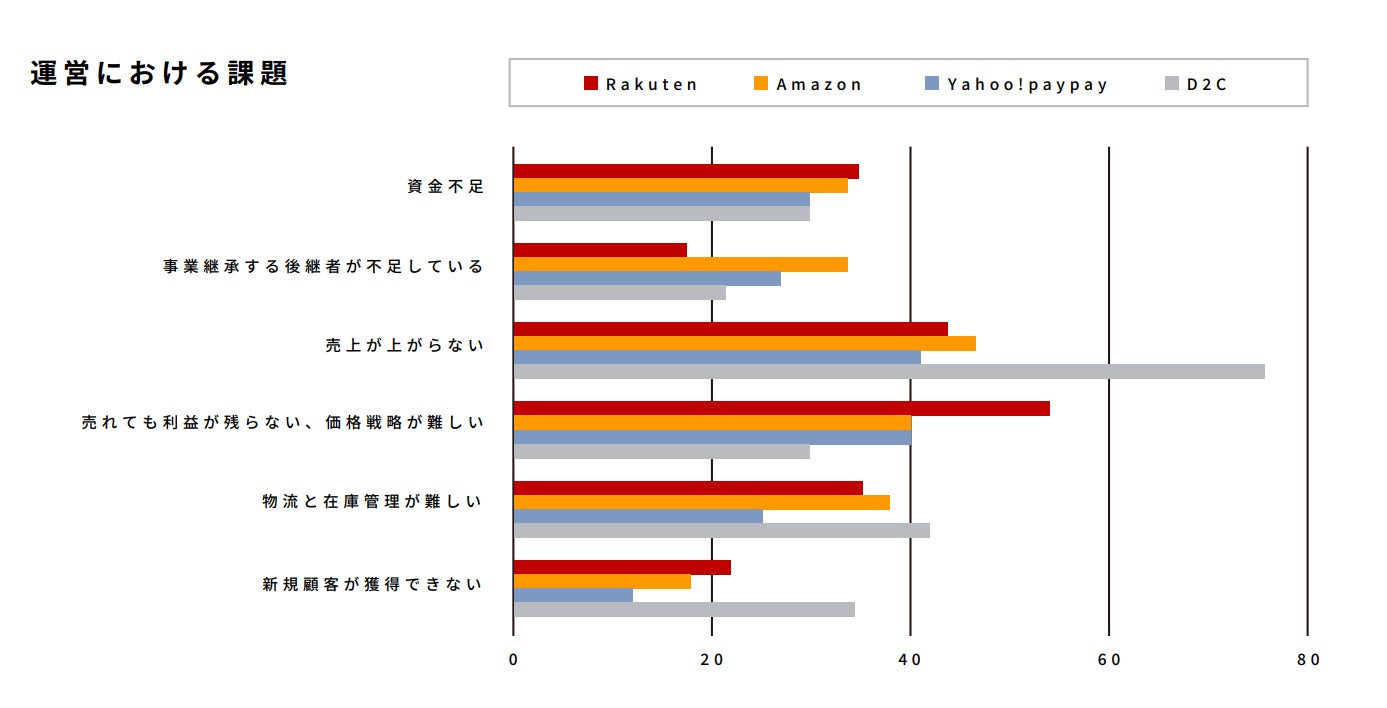 モールについては売上が上がらない、利益が残らない課題が多く、D2Cについては利益課題は比較的少ないが売上が上がらない課題が最も大きく現れました。