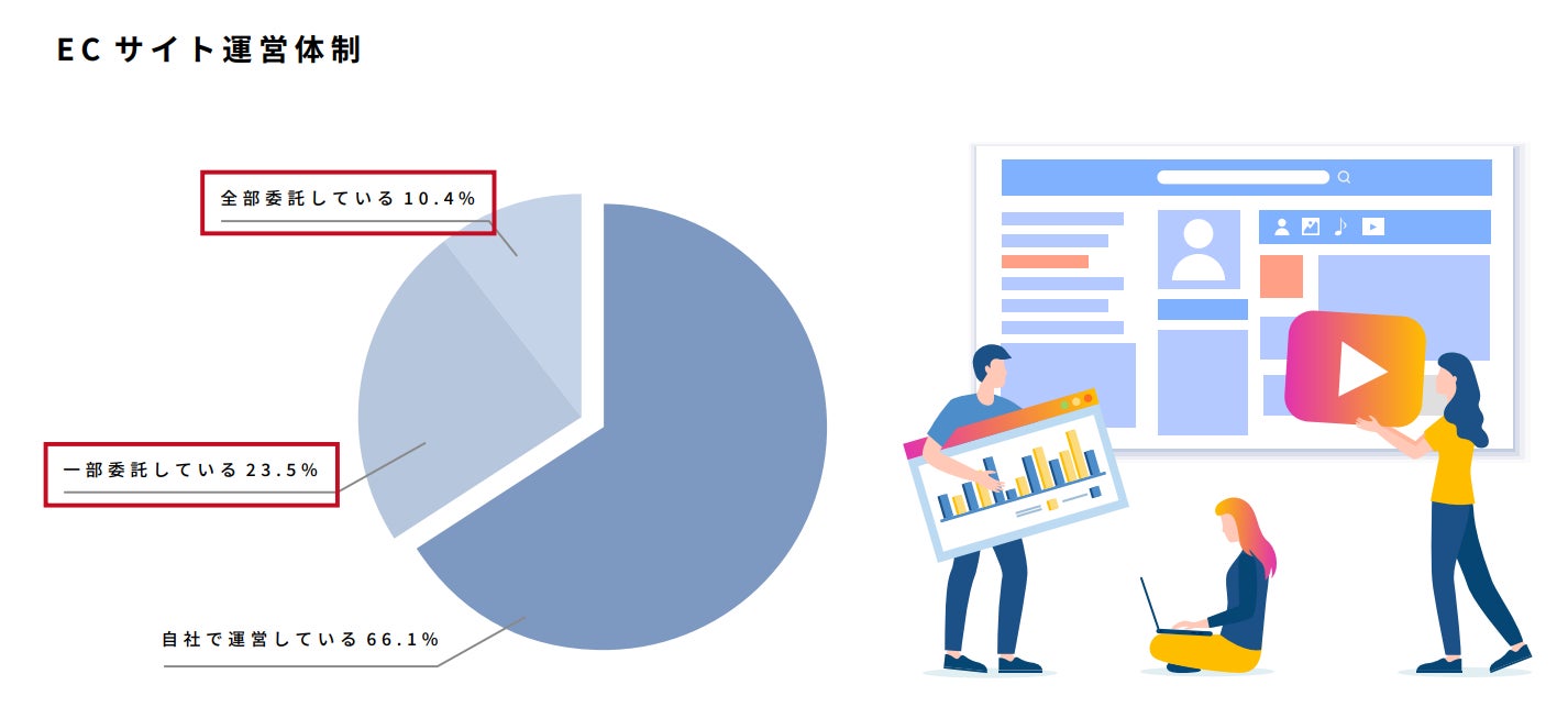 本調査結果では、ECモールへの出店割合は楽天市場が全体の27%、次点でAmazon、Yahooがいずれも高い水準で続き、運営体制としては約3分の1(内 全部委託が10.4%、一部委託が23.5%)が業務の一部または全部を外注しているという結果になりました。
