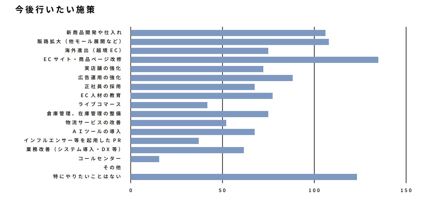 今後行いたい施策としてはECサイトや商品ページの改修が最も需要が高まりました。次点で新商品開発や仕入れ、また複数チャネルへの販路拡大、そして広告運用強化が続く結果となりました。EC市場においては競合が全国のエリアとなりますので、他社との差別化を訴求し、売れるための制作が求められることが読み取れます。