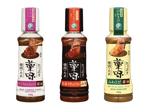 「たっぷり薬味焼肉のたれ 山わさび醤油」:北海道で長い年月をかけ育てたシャープな辛味が特徴の山わさびと、大根おろし、 たまねぎの食感が特徴のたれ