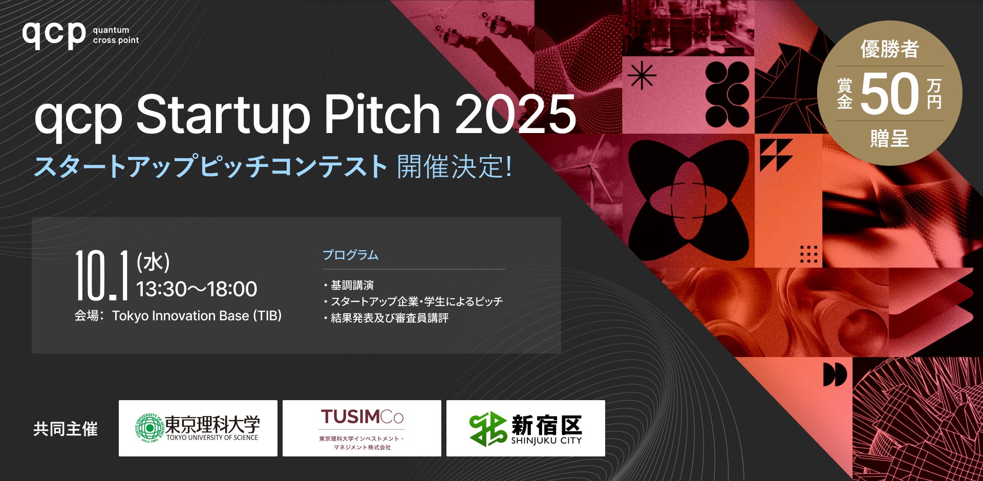 東京都認定インキュベーション施設「quantum cross point」を運営する東京理科大学インベストメント・マネジメント株式会社(東京都新宿区、代表取締役:片寄裕市)は、学校法人東京理科大学および新宿区と共同で、創業前後のスタートアップを対象としたピッチコンテスト「qcp Startup Pitch 2025」を、10月1日(水)に開催いたします。