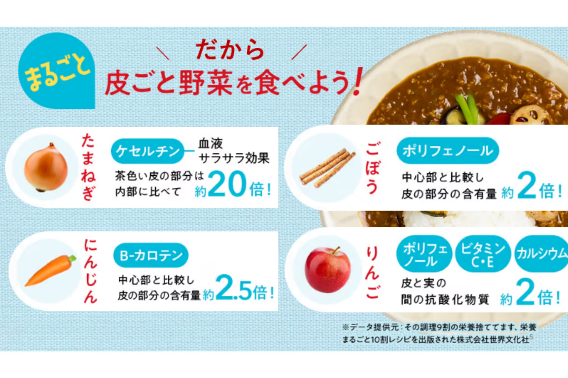 これまで当たり前に剥いて捨ててしまっていた野菜の皮には、実よりも多くの栄養素が含まれています。皮や根元を活用すれば、食材を余すことなく使え、栄養もより多く摂取できるだけでなく、調理の時短にもつながります。