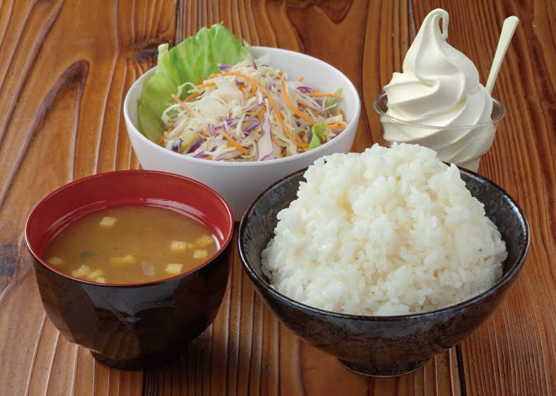 羽釜で炊いたご飯、味噌汁、サラダ、ソフトクリームは食べ放題。ご来店いただくほとんどのお客様がご注文されています。