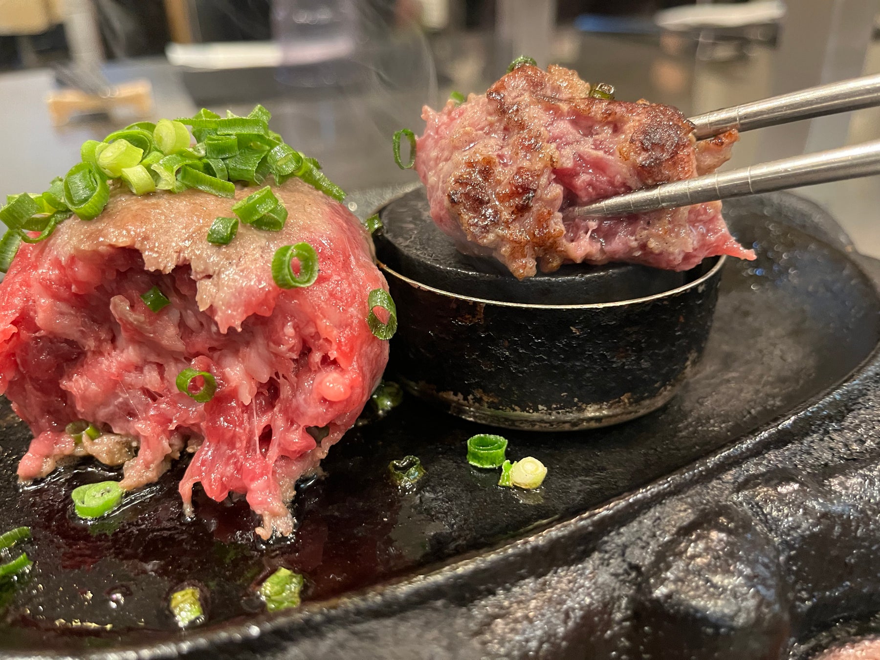スタッフが手ごねで仕上げたハンバーグは表面のみ焼き色を付け、中は生の状態でお客さまに提供。鉄板皿の上に乗った焼き石を使い、ハンバーグを一口サイズに切り分け、赤身がなくなるまでお客様ご自身で焼いていただきます。