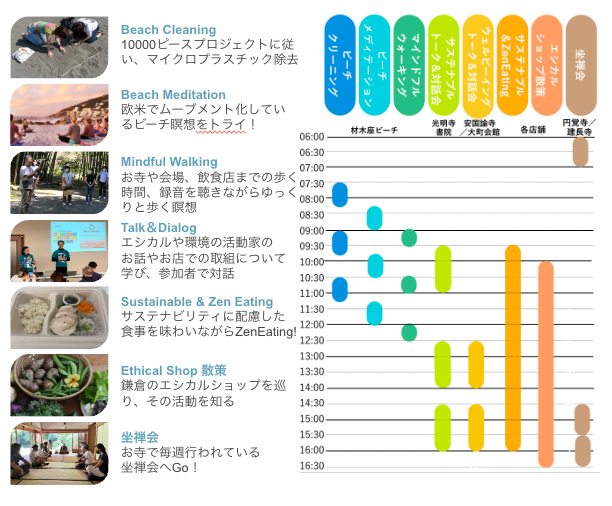 当日は、材木座海岸や鎌倉市内の寺院・公民館等複数の会場でイベントが開催されます。参加者は、思い思いに興味関心のあるイベントに参加することができ、初夏の鎌倉でマインドフルな1日を過ごすことができます。