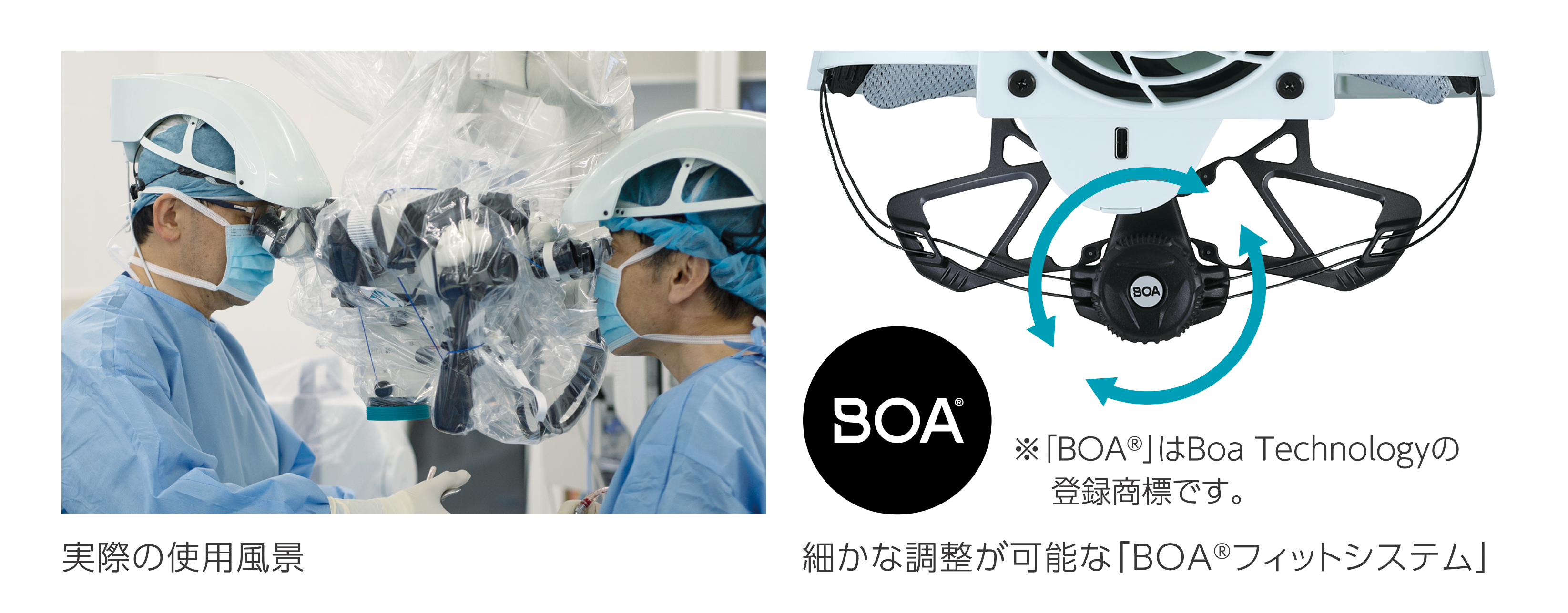 電動ファンを装備しながら軽量化を実現し(約350g)、さらに本体の重心位置を最適化。重さを感じさせない設計に。また頭部から本体を浮かせるフローティング構造、アジャスターにはきめ細かな調整と均一な締め付けでどんな頭部形状でもしっかり安定する「BOA®フィットシステム」を採用しています。すぐれたホールド性で、施術者を含めた使用する方の視野を、クリアに確保します。