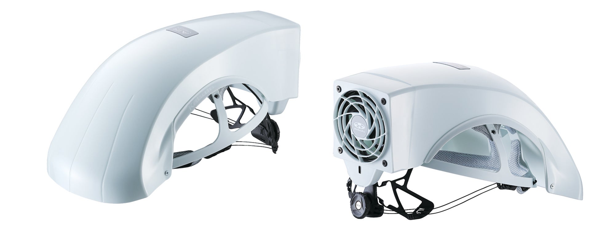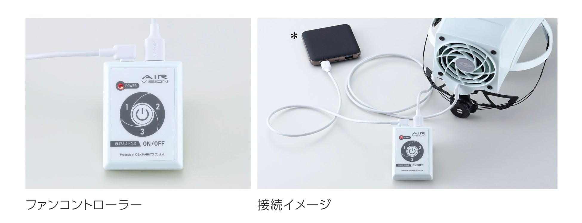 後頭部に装備した電動ファンを作動させることで、前頭部より空気がカーテン状に噴出されシールド効果が得られます。風力は3段階。センターボタンを押すことで調整できます。バッテリー*(別売)とコントローラー、本体への接続は付属のUSBコードで行います。