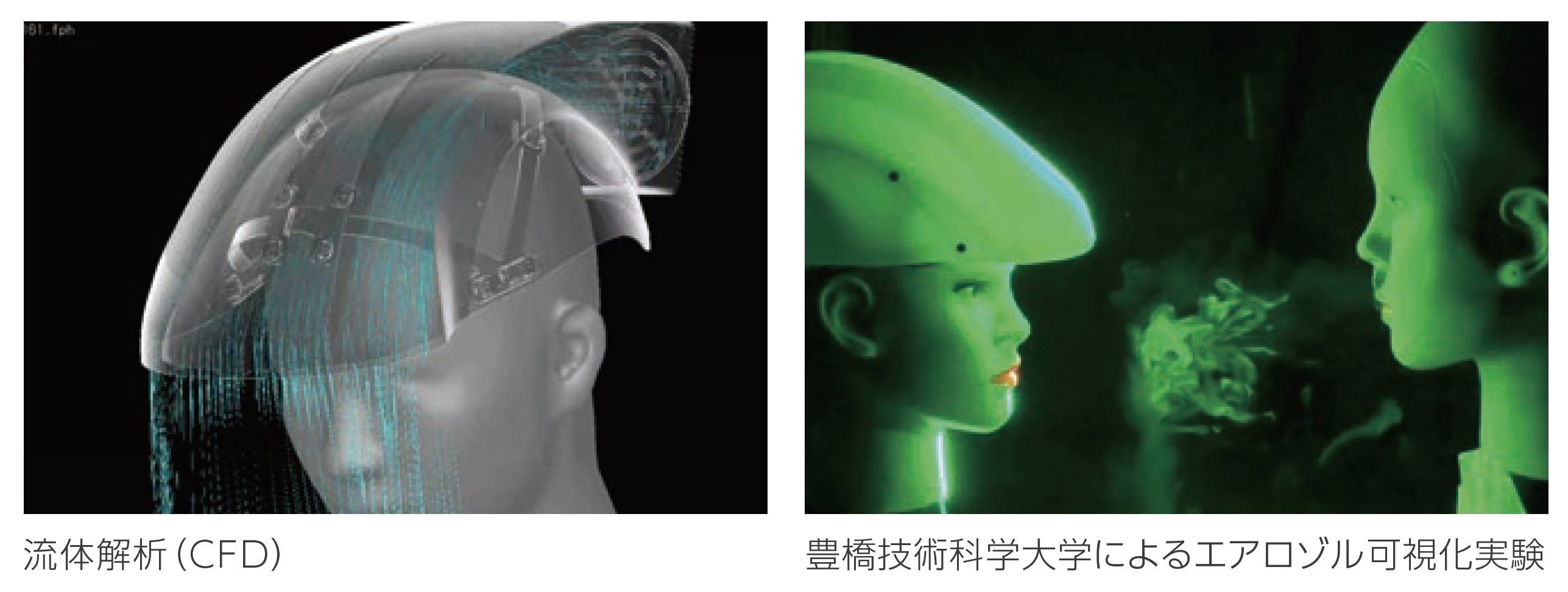 送風シールド機能については「CFD(流体解析)」を駆使し、「豊橋技術科学大学」との共同実験によって実現。作業従事者の顔に飛散するエアロゾルを、電動ファンによる空気のカーテンで防護します。