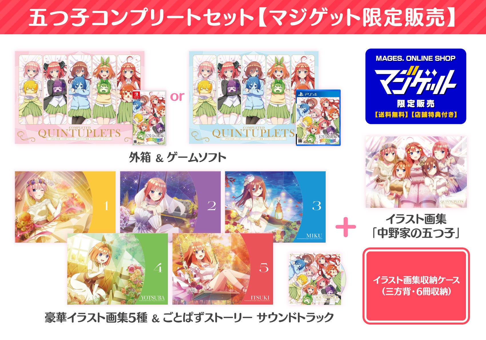 「MAGES. ONLINE SHOP マジゲット店」(https://maji-get.jp/ )限定にて、コンプリートセットも発売します。ゲームソフト、サウンドトラック、各「豪華イラスト画集セット」に収録されている画集5冊に加え、コンプリートセットのみでしか入手できないイラスト画集「中野家の五つ子」と6冊の画集を収めることができる「画集収納ケース(三方背・6冊収録)」を追加した内容となっています。価格は19,980円(税込)です。