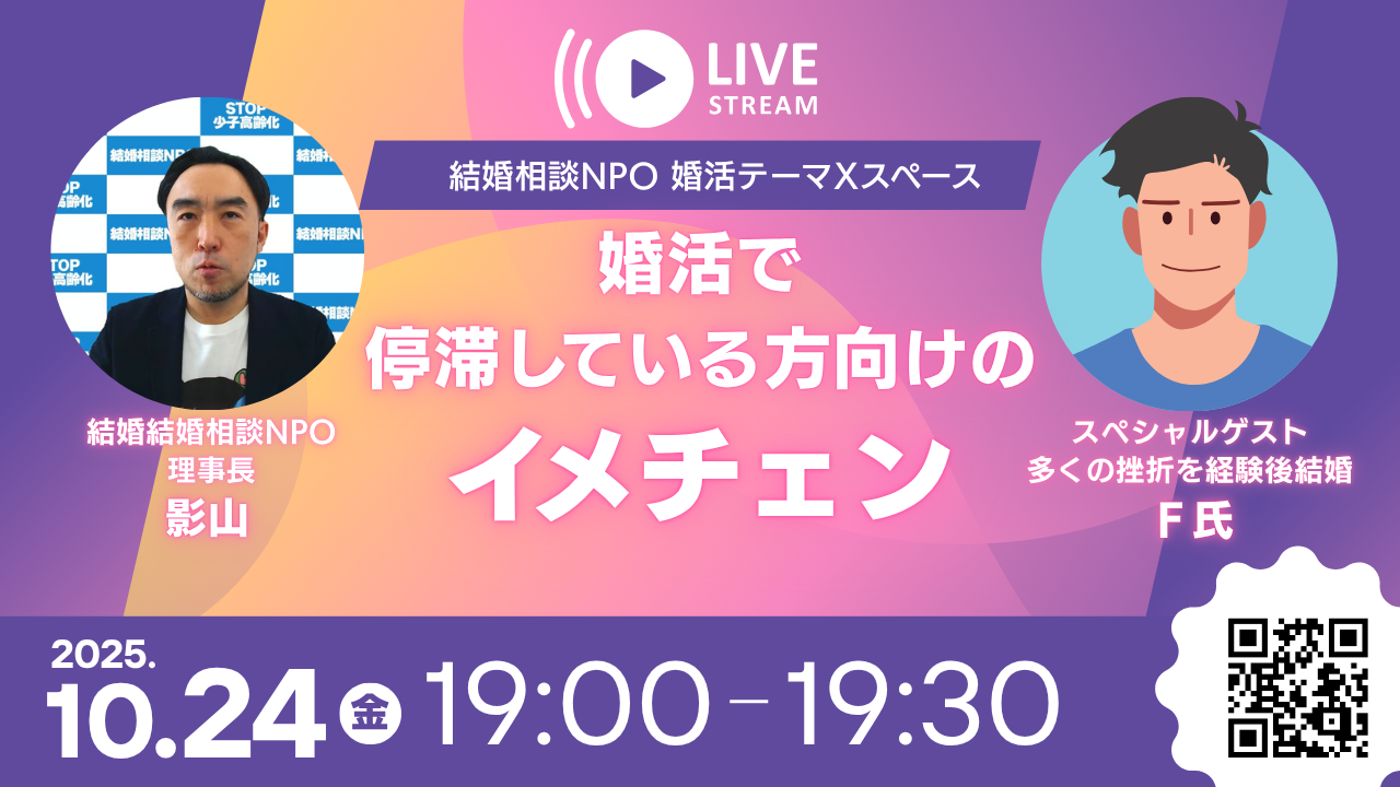 東京都認証特定⾮営利活動法⼈ 結婚相談NPO(所在地:東京都武蔵野市)は、2025年10月24日の19:00より公式 Xアカウントのスペースにて、婚活経験者との対談を実施致します。ホストは結婚相談NPO 代表の影山、記念すべき第一回のスペシャルゲストは婚活で多くの挫折経験を味わったというF氏、テーマは「婚活で停滞している方向けのイメチェン」です。F氏が挫折の上で取り組み、実際に婚活で効果を感じたイメチェン方法について語って頂きます。
