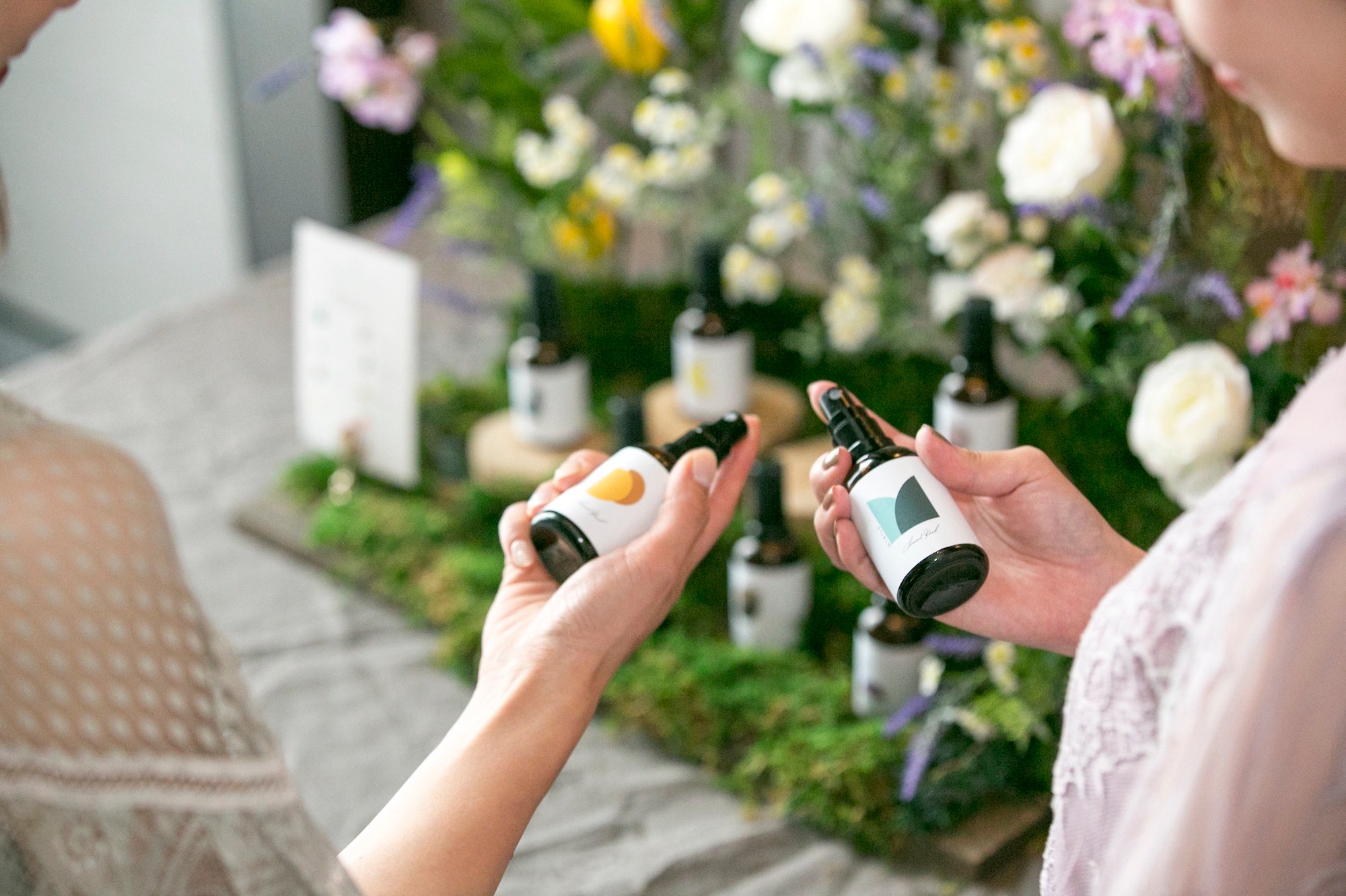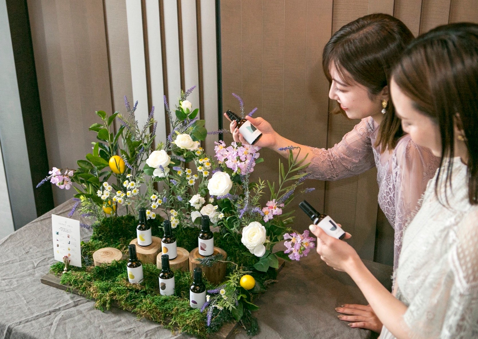 植物の天然成分から抽出された香料だけで生み出された香りのスプレー。新郎新婦の登場を待つゲストが好きな香りを纏うことで、入場シーンはより印象的で思い出深いものに。開発期間は約1年。UNO DESIGN代表の宇野プロデュースのもと、MEGUMI FUKATSU氏(A Green Inc.)により生み出されました。