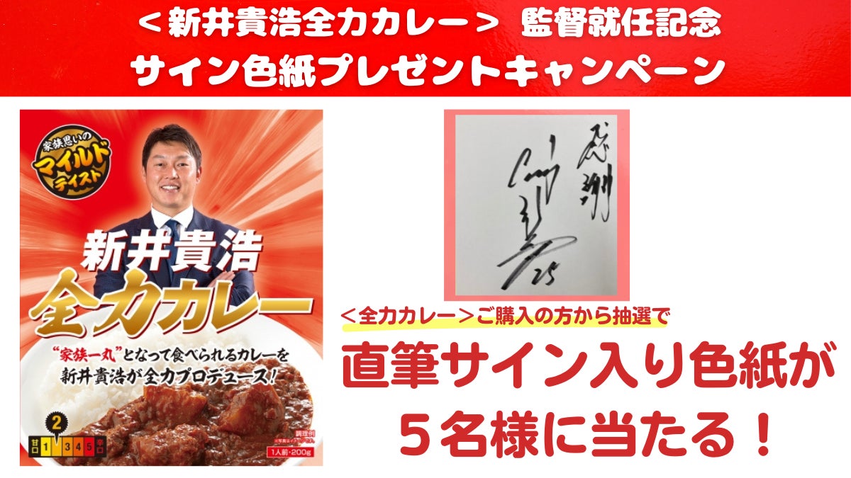 <全力カレー>をご購入のお客様に「新井貴浩監督直筆サイン入り色紙」を抽選で5名様にプレゼントします。