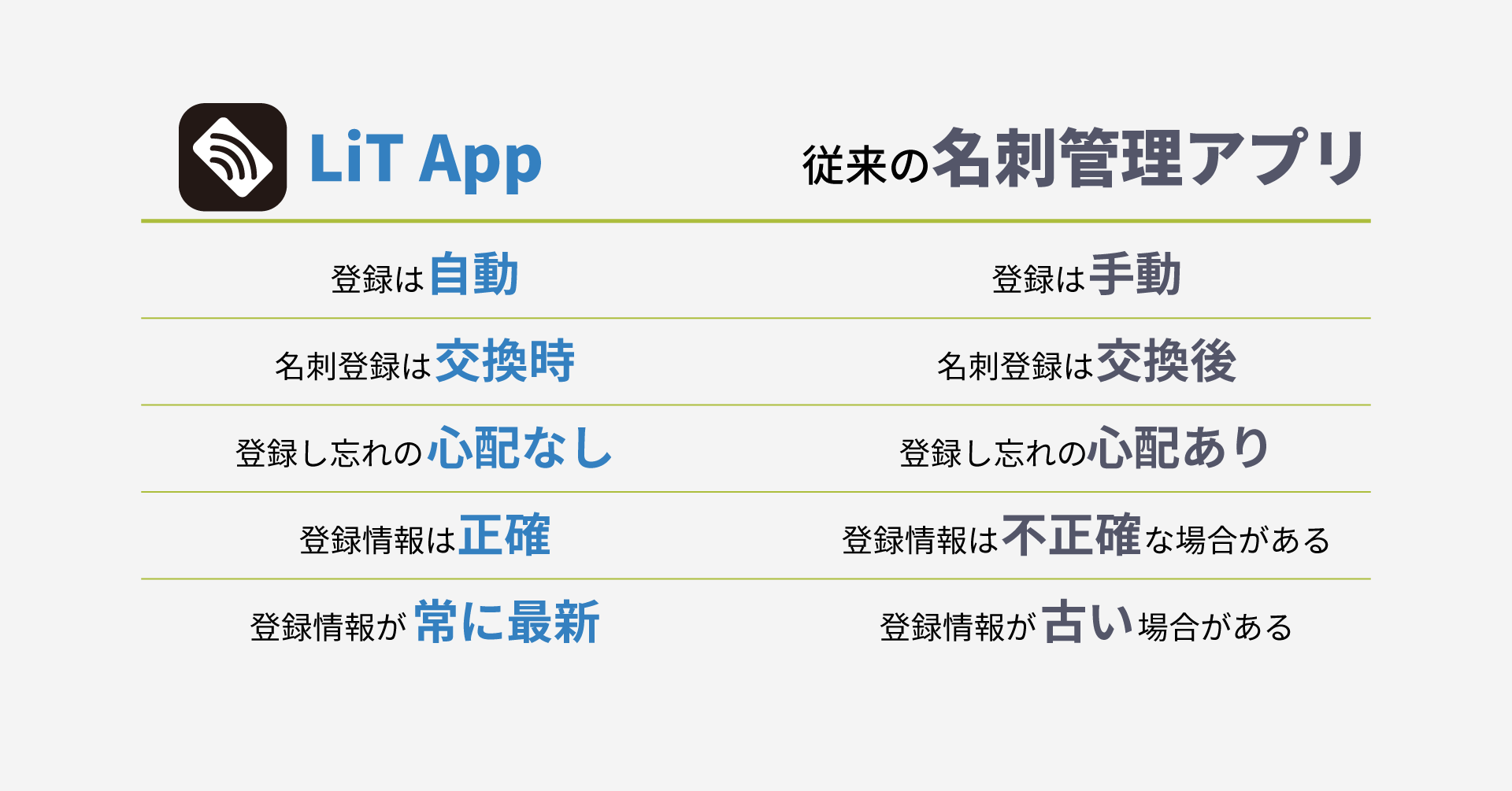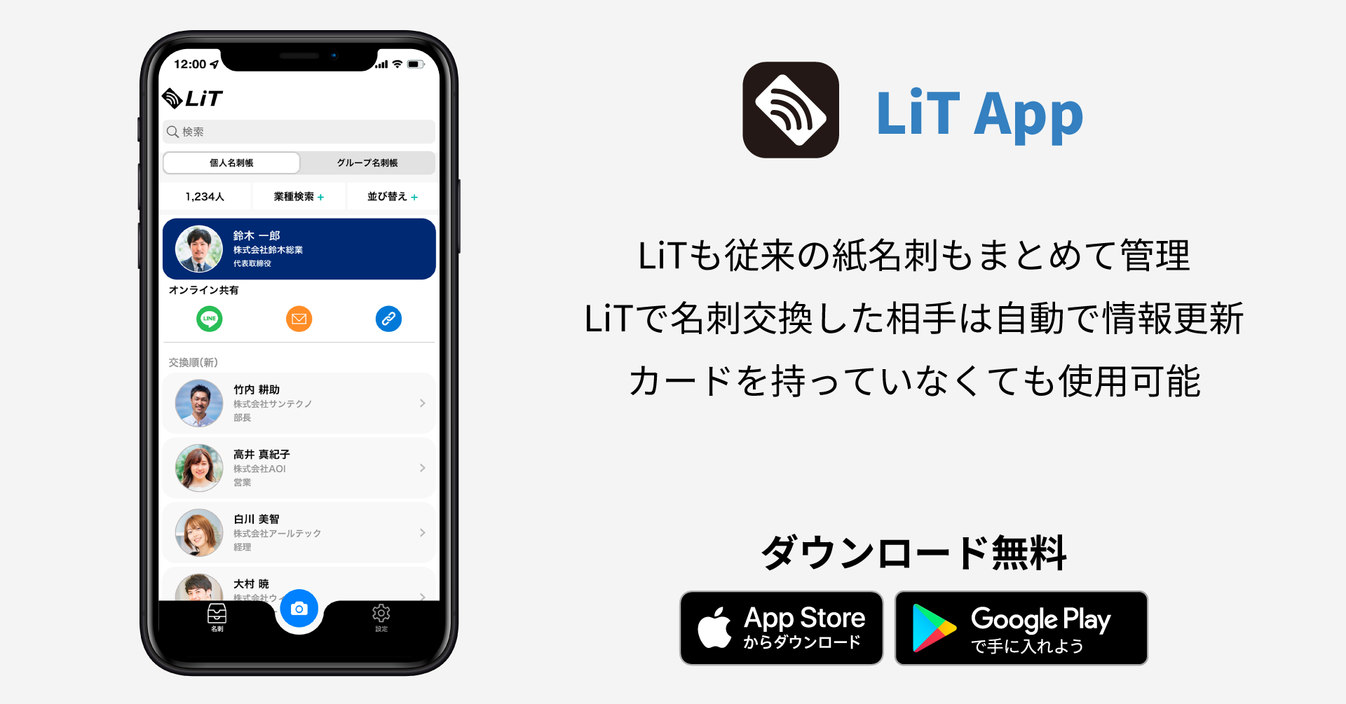 LiT Appは、LiT Cardを含めた名刺を管理するスマートフォンアプリです。LiT Cardと連携しており、例えば相手がプロフィール情報を更新した場合、瞬時にアプリ内の情報も更新されます。つまり、常に最新の名刺情報管理が可能です。