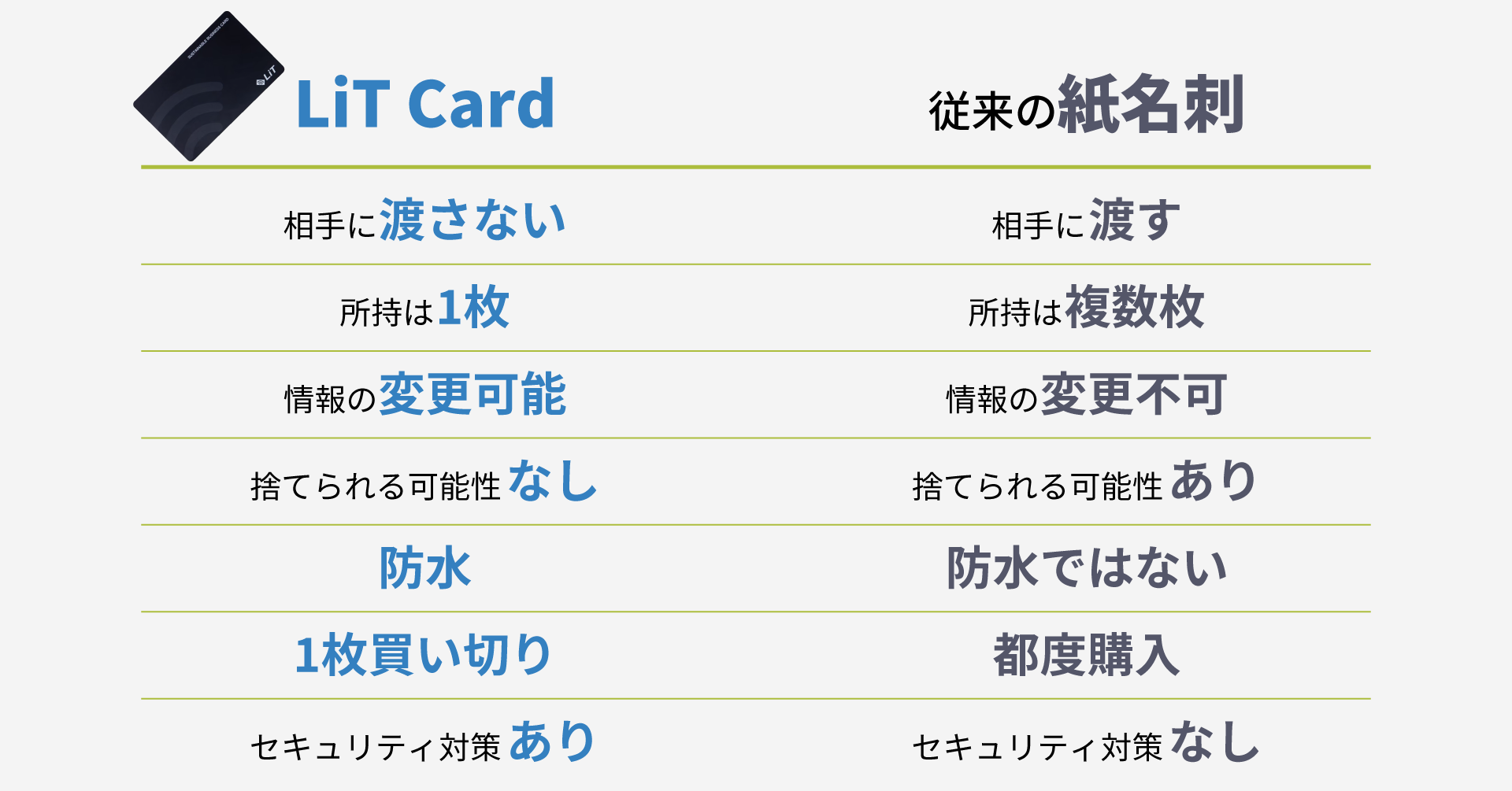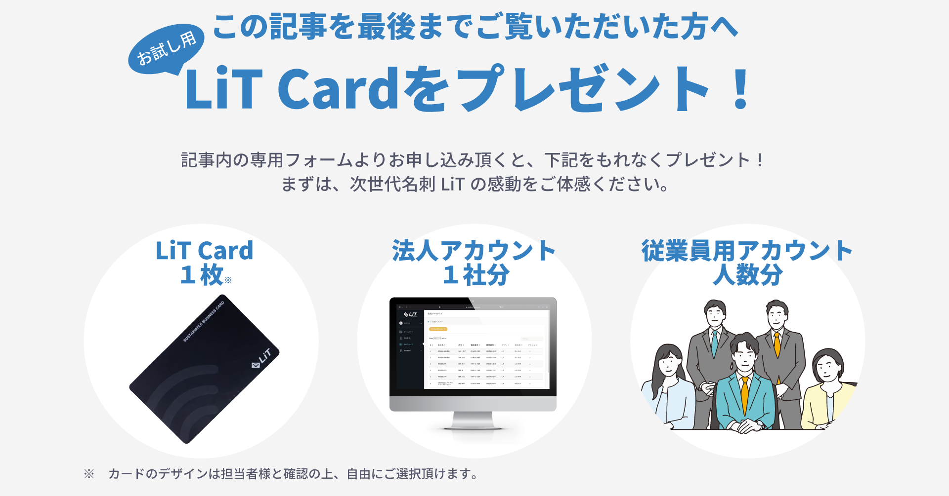 LiT Cardは、スマートフォンにかざすだけで名刺交換を行える、画期的な次世代名刺です。