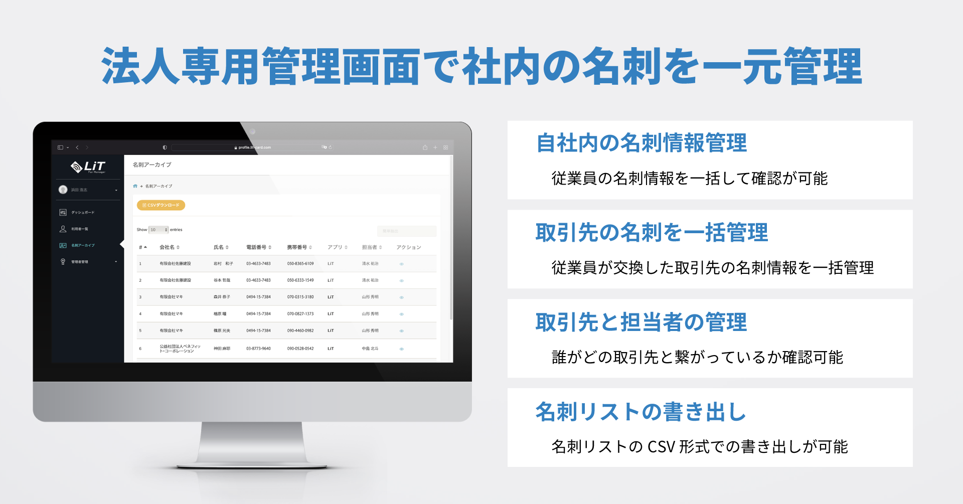 LiTは法人契約があります。法人契約の場合、法人アカウントを発行し、管理画面を付与致します。法人アカウントに結びついた従業員個人のアカウントを発行することで、従業員の名刺情報を管理するだけでなく、従業員の交換した名刺情報も全て管理が可能になります。誰が交換した名刺かも確認でき、顧客管理をよりスムーズに行う事ができます。