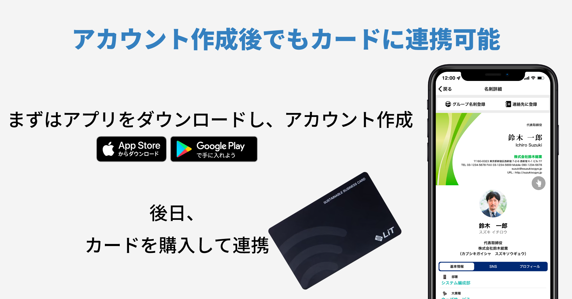 ダウンロード方法:iOS端末はApp Store(https://apps.apple.com/jp/app/id1614197817 )、Android端末はGoogle Play Store(https://play.google.com/store/apps/details?id=com.litcard.app )からダウンロード