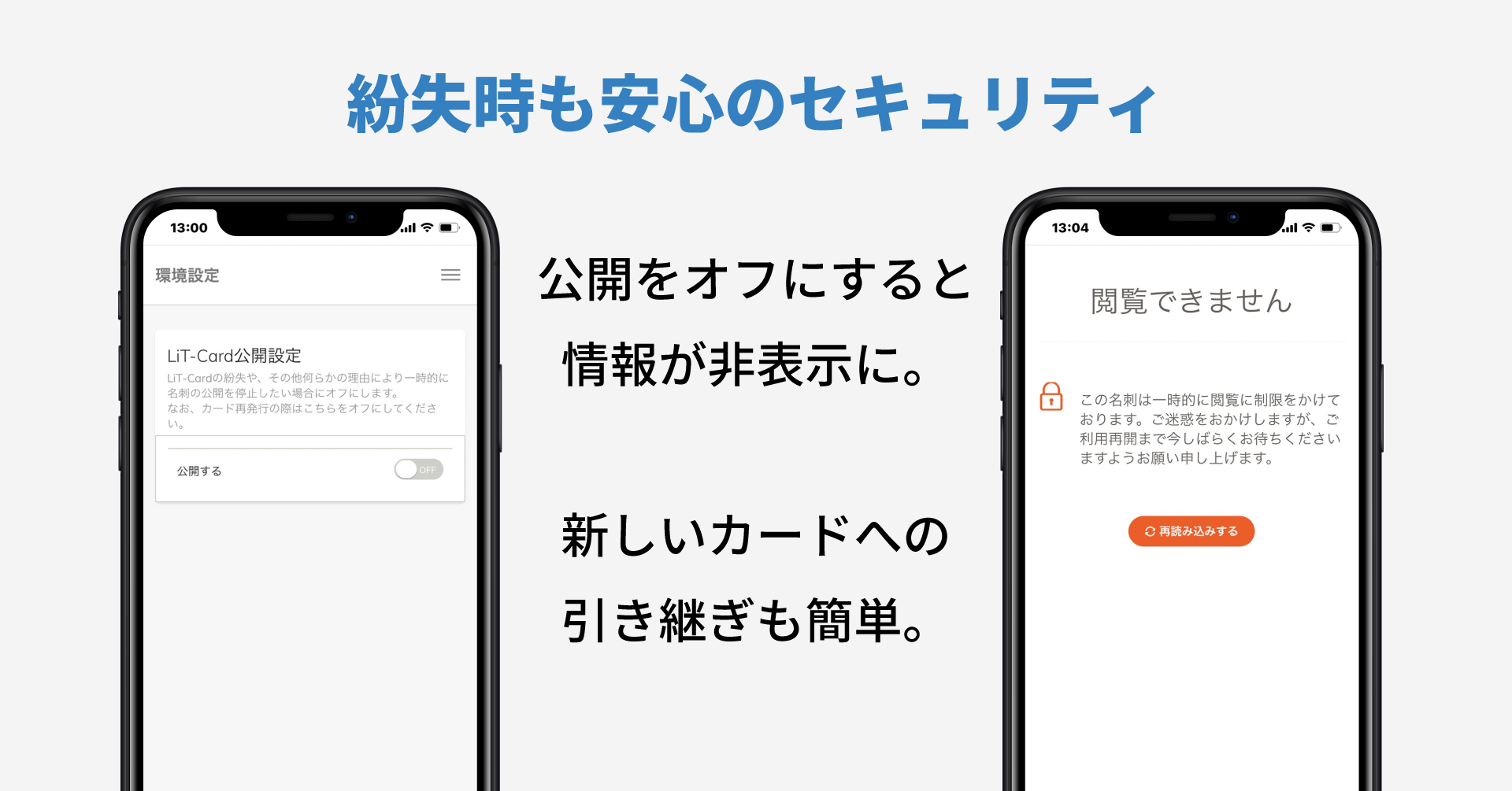 また、LiT Cardを紛失した際は、マイページからいつでも公開を停止する事が可能できるよう、安心のセキュリティー対策を施しております。公開を停止する事で、LiT Cardはただの何の情報も持たないカードになります。更に、新しくカードを購入し、紛失したカードのアカウントログイン情報を入力することで、以前の情報を引き継ぐことも可能です。