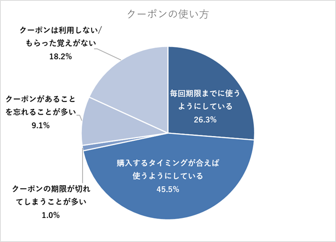 クーポンの場合、期限が比較的短期間で設定されていることが多いためか、毎回期限までに使うようにしている方は、3割以下となっています。また、ポイントと違って商品購入時に毎回利用するものではないため、クーポンがあることを忘れていたり、期限が切れてしまったりする方も1割程度いるようです。