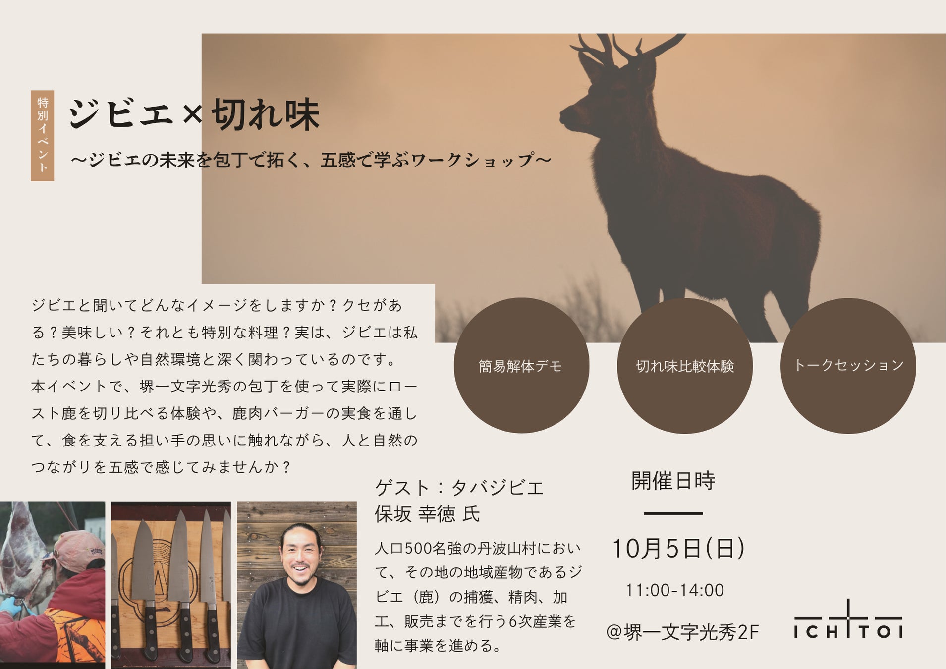 包丁ブランド「堺一文字光秀」を展開する一文字厨器株式会社(所在地:大阪府大阪市中央区難波千日前14-8)は、2025年10月5日(日)、同店2Fのイベントスペース「ICHITOI」にて、鹿肉の捕獲から加工・販売までを手掛ける「タバジビエ」代表・保坂 幸徳氏をゲストに迎えた体験型ワークショップを開催します。