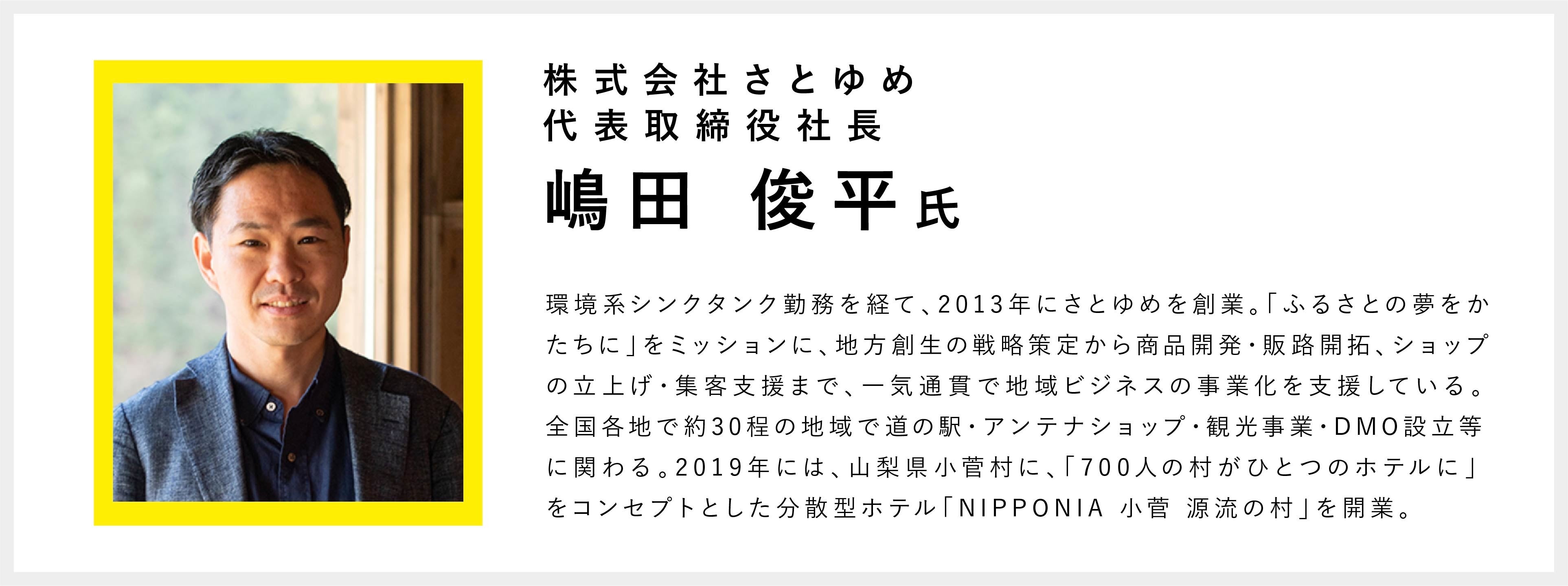 講座の中盤の3回では、地方創生のスペシャリスト「さとゆめ」代表の嶋田が、20年以上の事業開発・運営の経験を踏まえ、ローカルビジネスに必要なマインドやスキルをお伝えします。どのように地域の理解・協力を得るのか、どのように地域でビジネス上の優位性を生み出すのか、事例も交えて学びます。