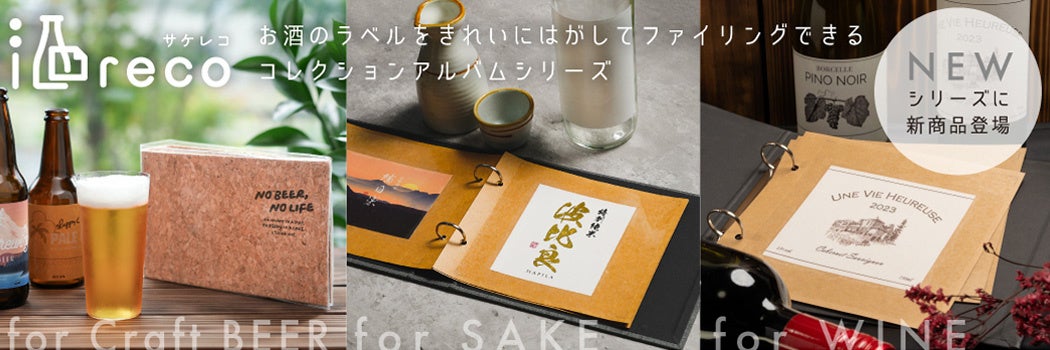 「酒reco」は、お酒のラベルをきれいにはがしてファイリングできるアルバムシリーズ。ご好評いただいた第一弾の「日本酒用」に続き、「ワイン用」、「クラフトビール用」が新登場!また、日本酒用、ワイン用の記録シールも新たに販売いたします。