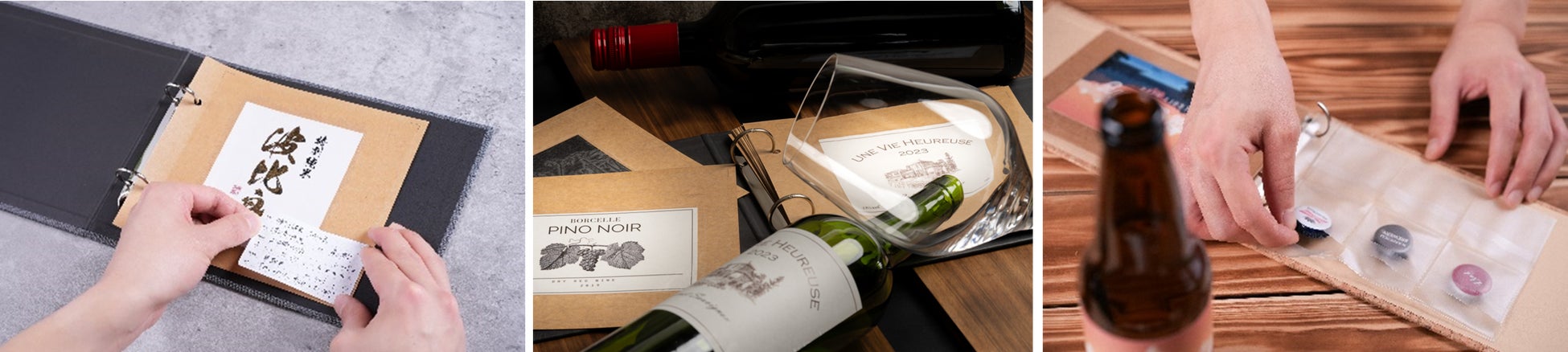 ラベルはがしシートを使って、時間をかけずにラベルを簡単にファイリング可能。コレクションの入れ替えや整理がしやすいリフィールタイプです。「乾杯セット」は専用バインダー、ラベルはがしシート6枚、台紙3枚がセットになったスターターセット。クラフトビール用には、王冠も一緒に収納できるリフィール付きです。ワイン用バインダーは、PUレザーに型押しロゴを施した高級感溢れる仕様に。コルク風に仕上げたクラフトビール用バインダーは、彫刻ロゴ入りです。また、追加用リフィールの「ほろ酔いセット」もご用意。ご自宅でのお酒ライフがさらに楽しくなるようなコレクションアルバムです。