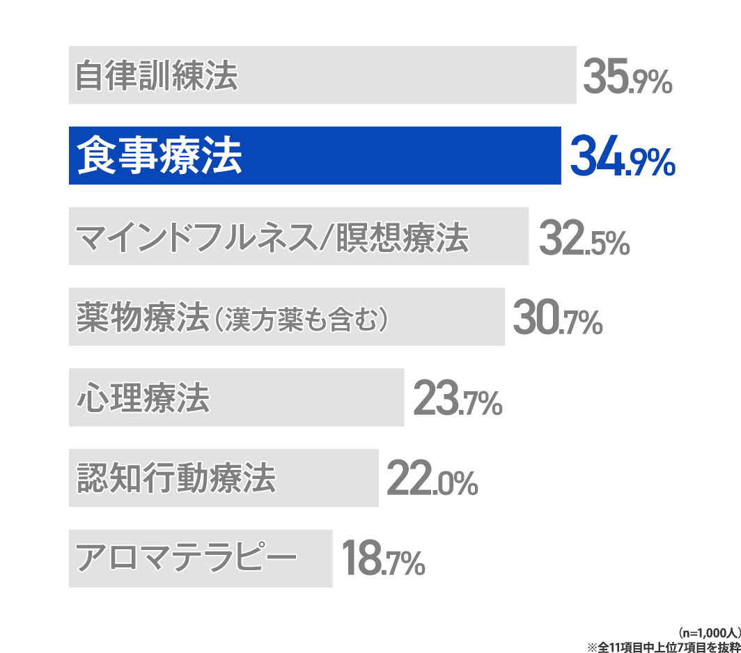 心の不調を抱える患者に対して重視している治療法を聞くと、「自律訓練法」(35.9%)、「食事療法」(34.9%)、「マインドフルネス/瞑想療法」(32.5%)、「薬物療法(漢方薬も含む)」(30.7%)が上位に挙がりました。3人に1人の医師が、心の治療法として「食事療法」も重視していることがわかりました。