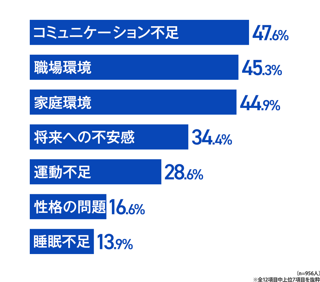 - 心の不調の原因TOP3は「コミュニケーション不足」「職場環境」「家庭環境」