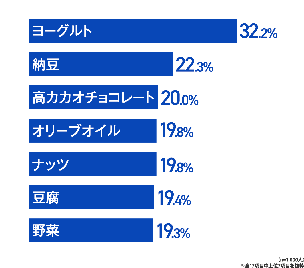 心の不調を抱える患者に勧めたい食材を聞くと、TOP3は、1位「ヨーグルト」(32.2%)、2位「納豆」(22.3%)、3位「高カカオチョコレート」(20.0%)となりました。4位以下は、「オリーブオイル」(19.8%)、「ナッツ」(19.8%)、「豆腐」(19.4%)、「野菜」(19.3%)が僅差で並びました。1位の「ヨーグルト」は、胃で働く乳酸菌を含む商品も発売されており、心の不調改善に役立つ食材として、多くの医師が推奨していることがわかりました。