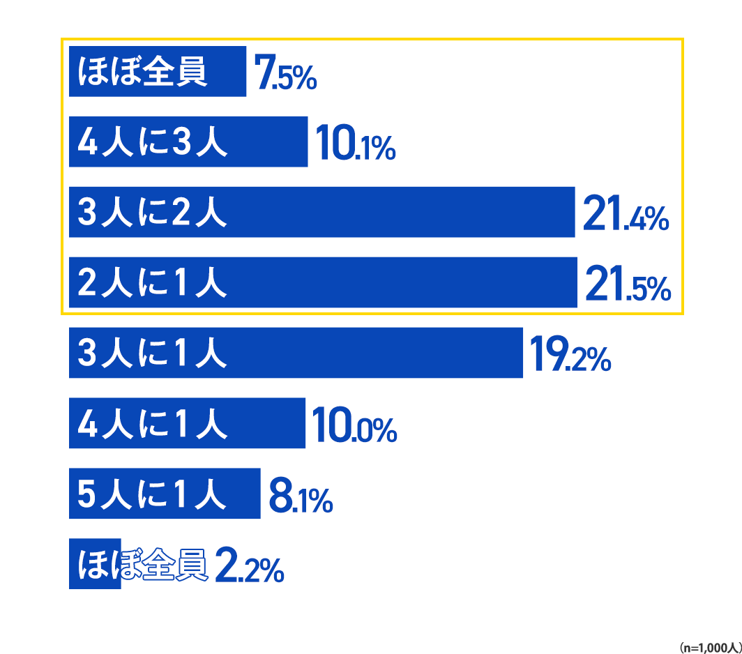 心の不調を抱える患者の中に、胃の不調を訴える人はどのくらいいるのか聞いたところ、「2人に1人」(21.5%)、「3人に2人」(21.4%)、「4人に3人」(10.1%)、「ほぼ全員」(7.5%)を合わせ、半数以上の医師が「2人に1人以上」と回答しました。心の不調を抱える患者は、胃の不調にも悩まされている実態が浮き彫りとなりました。