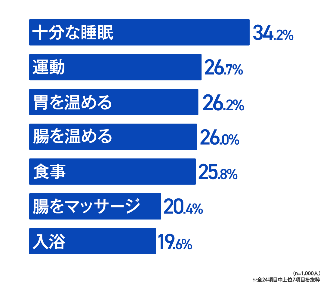 心の不調を抱える患者に勧めたいセルフケアの方法について聞いてみると、最も多かった回答は「十分な睡眠」で34.2%。次いで、「運動」(26.7%)、「胃を温める」(26.2%)、「腸を温める」(26.0%)、「食事」(25.8%)の順となりました。