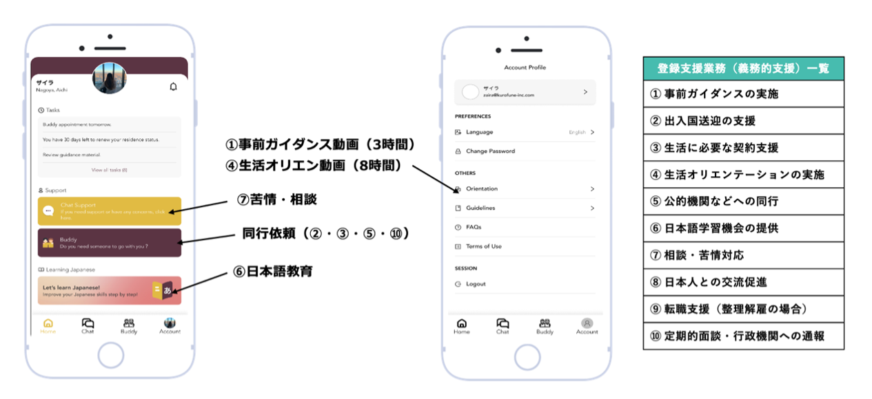 KUROFUNEは現在2つのアプリを運用しています。在日外国人に対して、日本での就職活動を支援するアプリ「KUROFUNE」と、2019年4月から運用が始まった特定技能労働者の法的支援と定着支援をアプリ上で行う「KUROFUNE PASSPORT」です。