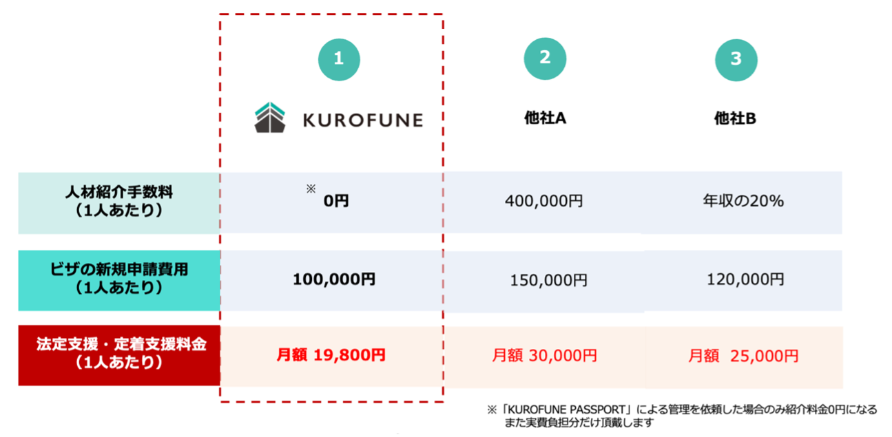 2019年に新設された「特定技能」は、1日に約380人が増加する(2025年4月〜2025年6月の3ヶ月間の平均:出入国在留管理庁 外国人材の受入れ及び共生社会実現に向けた取組を参照)ほど人気の在留資格です。しかし転職が可能であるために、なかなか自社内に定着できないといった課題を抱えている企業が多くあります。既存の人材紹介業界のモデルであると、人材紹介手数料が主な収入益となっているため、「特定技能」労働者の定着支援まで行うことができないと考え、「外国人の採用市場の常識を変える」ために、法定支援・定着支援を行う「KUROFUNE PASSPORT」アプリを自社開発し、業界では考えられなかった新しい料金体系でサービスを提供しています。