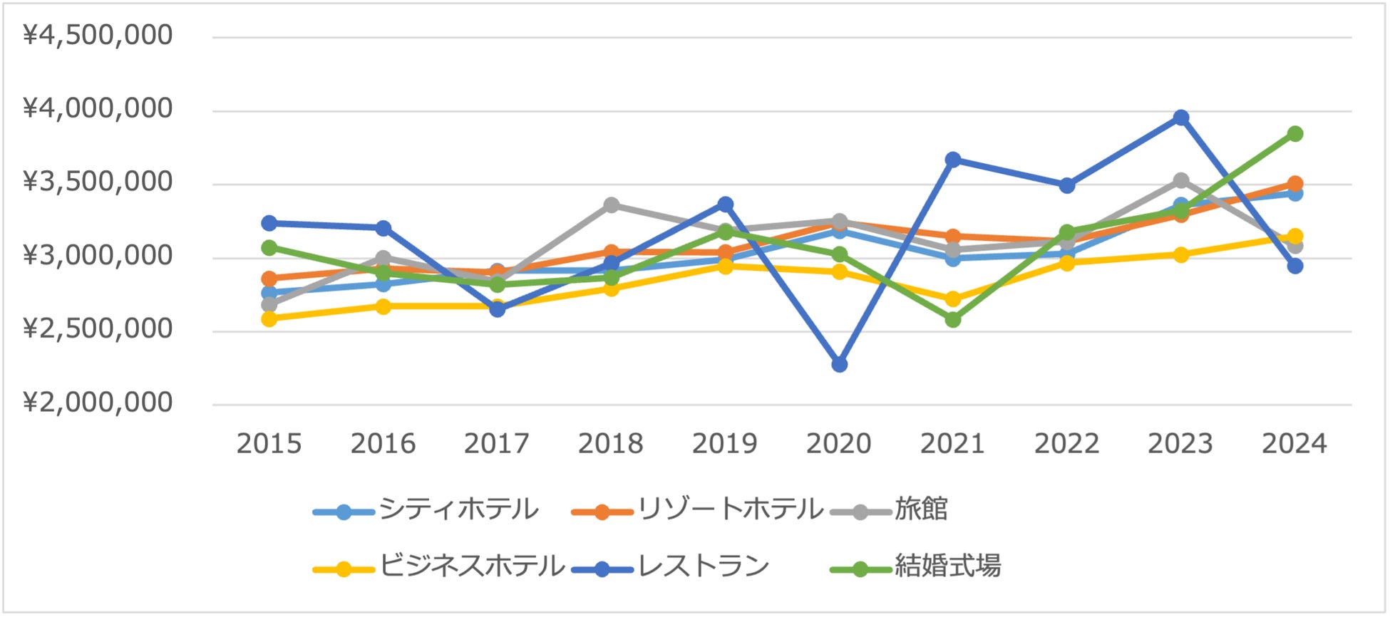 旅館はその規模や地域によってばらつきがあるものの、給与水準はホテル系と同程度かやや低めで推移しました。従来から人手不足が指摘される業態でもあり、コロナ後は人材確保のため給与条件を引き上げる動きが見られます。
