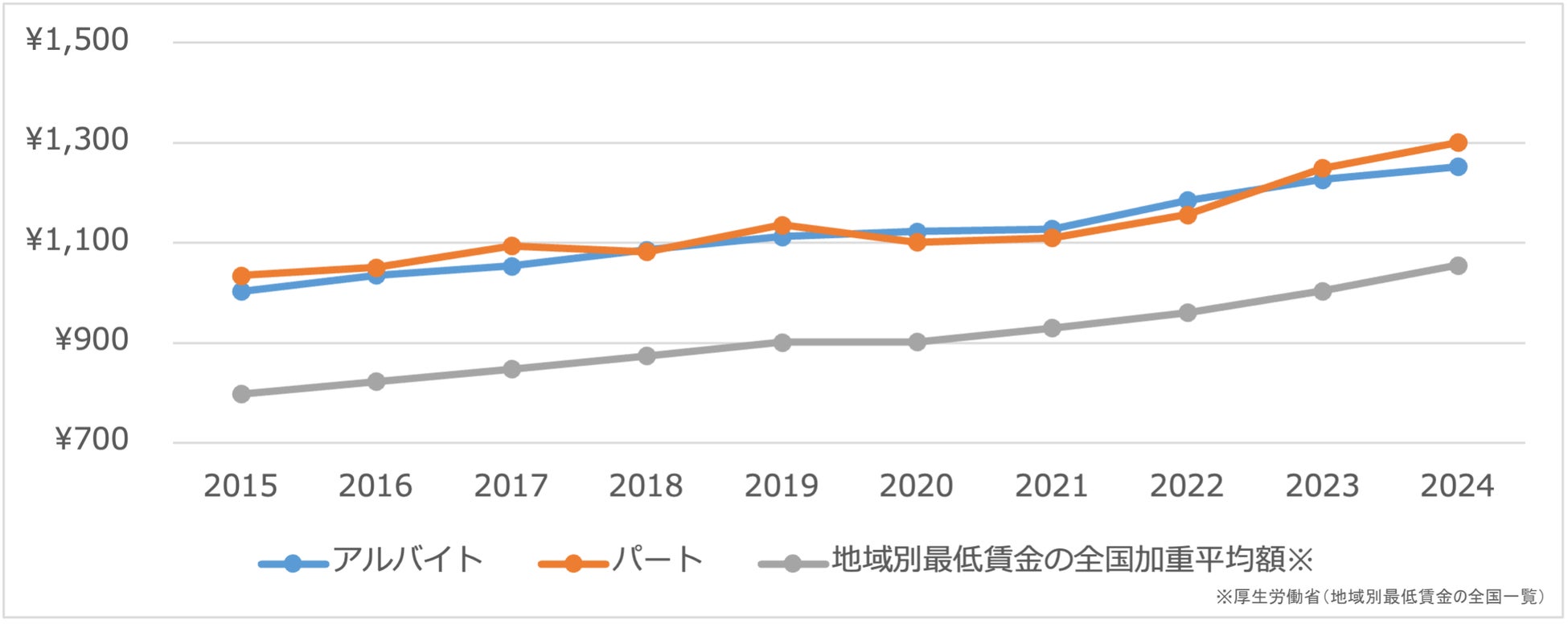 アルバイト・パートの時給推移: 2015〜2019年は緩やかな上昇傾向で、年平均成長率約2.0%と最低賃金の上昇率(平均約2.8%)をやや下回る水準でした。しかし2020〜2022年はコロナ禍の影響で外出自粛や営業休止が相次ぎ、時給は成長率0%〜マイナスと停滞・減少しました。その後、2023年5月の感染症法上の分類見直しやインバウンド再開による宿泊需要急増に伴い、2023年には採用時給が急上昇します。特に需要回復期の人手不足を補うため採用活動が活発化し、一時は前年比+13.8%超という大幅な時給アップが記録されました。2024年もこの高水準を維持して推移しており、同年秋に実施された最低賃金制度の全国平均賃金推移は過去3年間(961円→1,004円→1,055円)の大幅引き上げが下支えとなって、ホテル業界の時給相場はコロナ前より明らかに底上げされています。