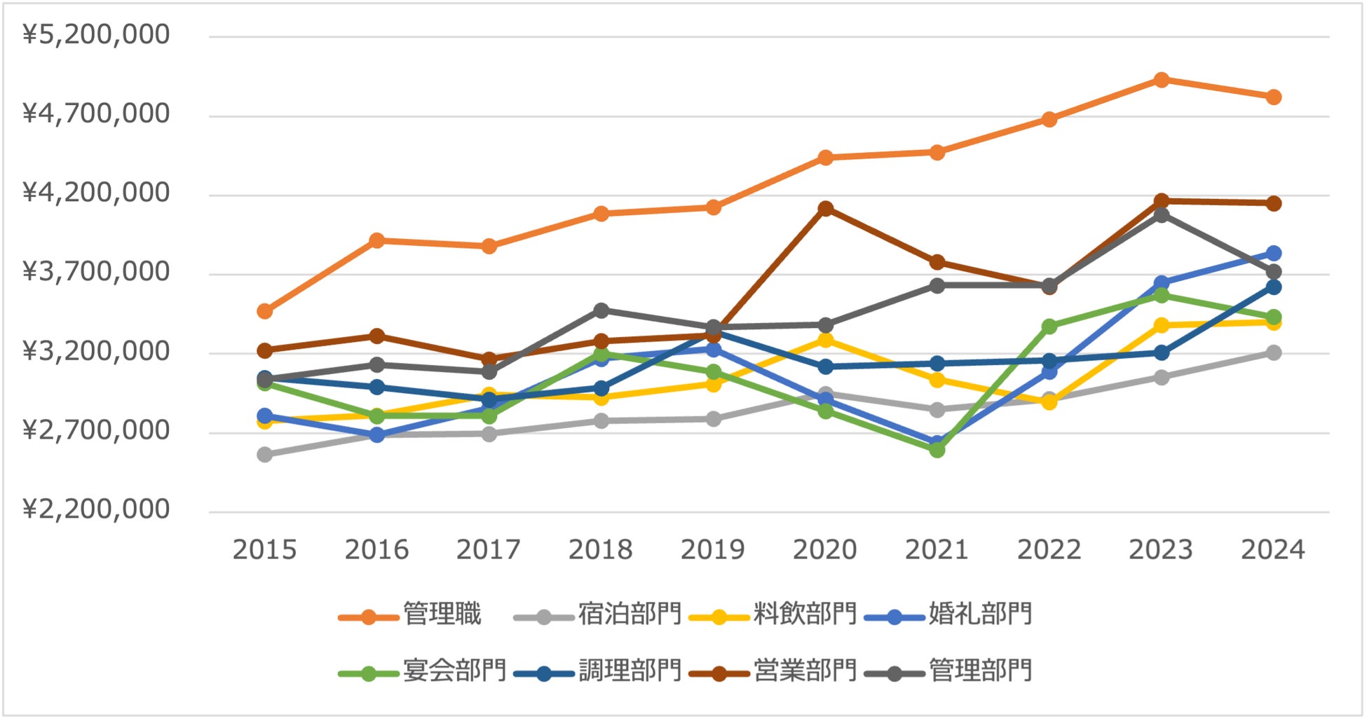 現場スタッフを中心とした宿泊部門/料飲部門/宴会部門の職種は、コロナ禍で営業時間短縮やイベント自粛の影響を受け、一時給与が伸び悩みました。しかし需要回復期には人材不足が顕在化し、緩やかながら上昇に転じています。