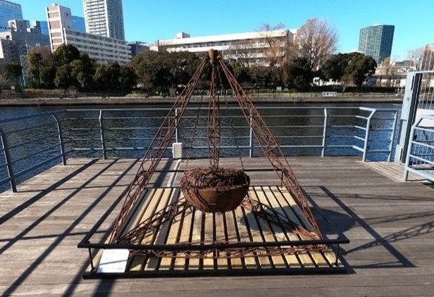 太古から姿を変えず生き続けている「オウムガイ」。その強い生命力をイメージした造形が、鉄筋のフレームで囲まれた空間に存在する。海へつながる天王洲の運河に、時間の流れや、錆びゆく鉄の経年変化を感じつつ、太古の海に思いを馳せて、楽しんでいただきたい。