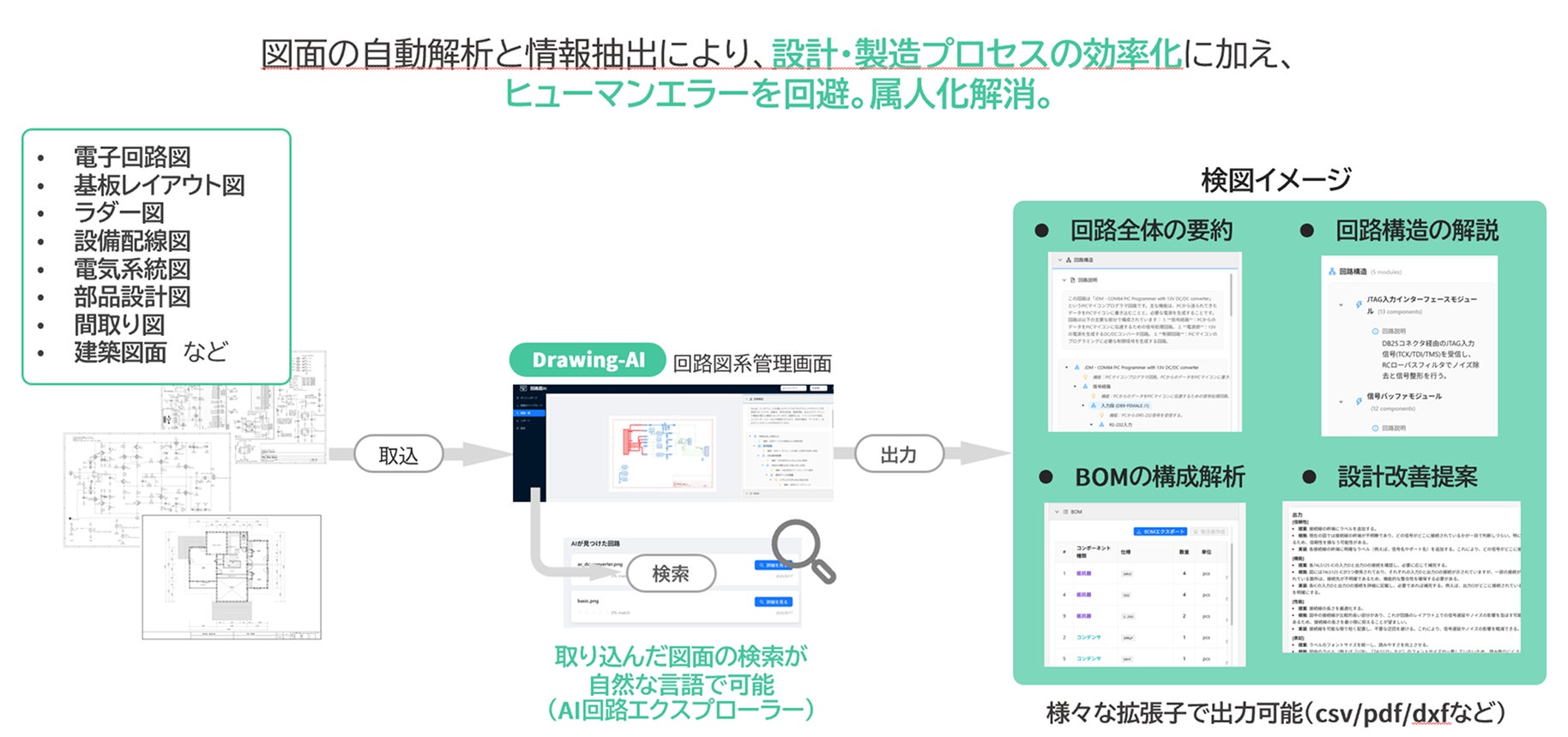 「図面解析AI(Drawing-AI)」は、AI-OCR、画像認識、構造化エンジンを組み合わせることでこれらの課題を解決。PDF / JPG / PNGなどの主要フォーマットを網羅し、専用UIで回路とメタ情報を可視化します。