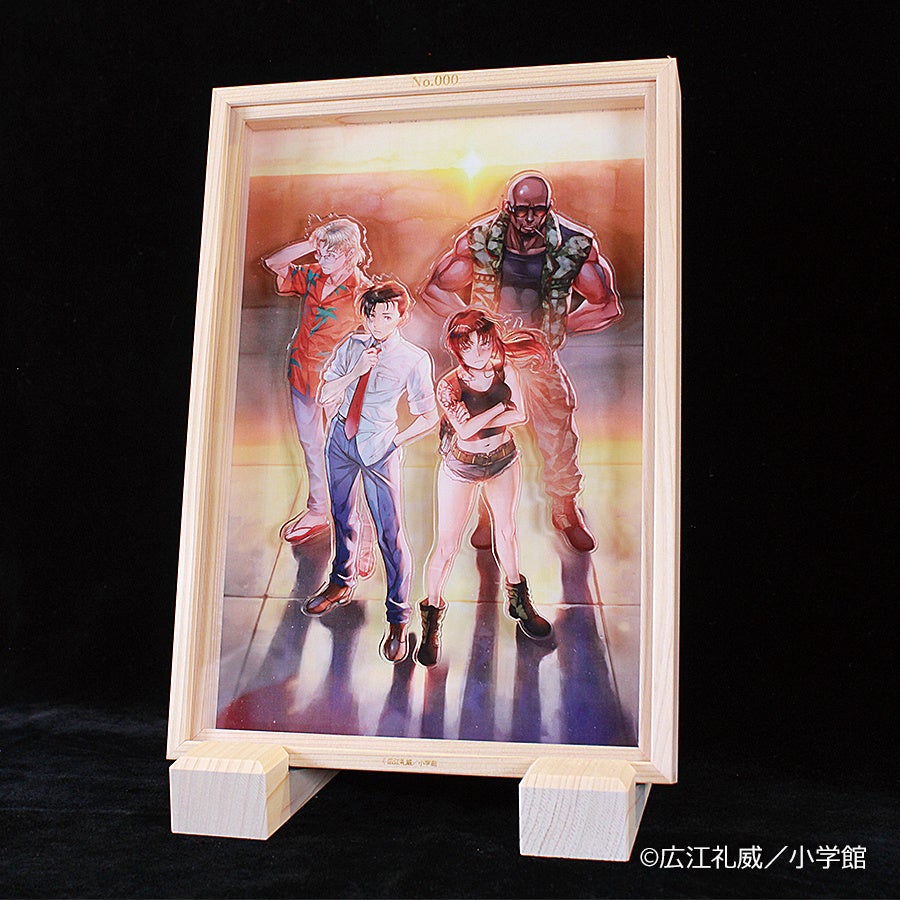 夕日に照らされたクールなラグーン商会の美麗な集合イラストを、立体的なアクリルジオラマに仕上げました。国産の木枠で、温かみと高級感を演出しています。シリアルナンバーが刻印された30個限定のレアアイテムです。
