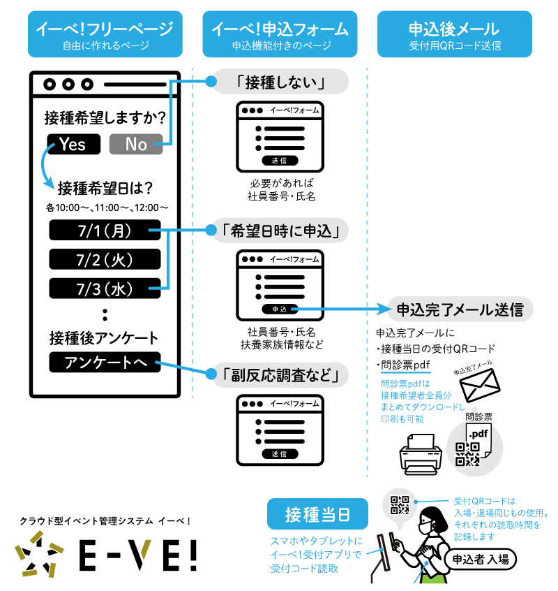株式会社フラッグシステム運営のイベント管理システム「イーべ!」を職域接種の申込・受付管理にご利用いただいています。シンプルな申込フォームと、接種当日、QRコード受付で密を避けスムーズな受付を支援します