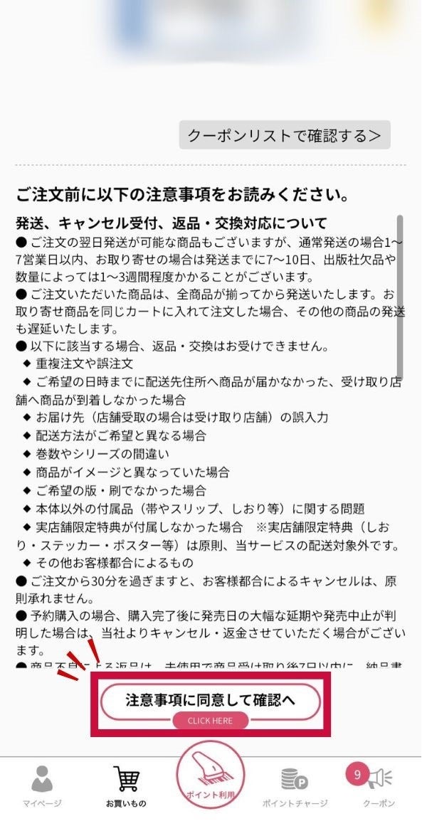 6.利用可能なクーポンを選択後、「注意事項に同意して確認へ」をタップ。