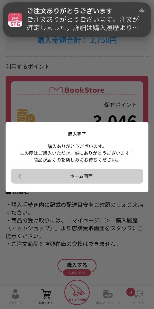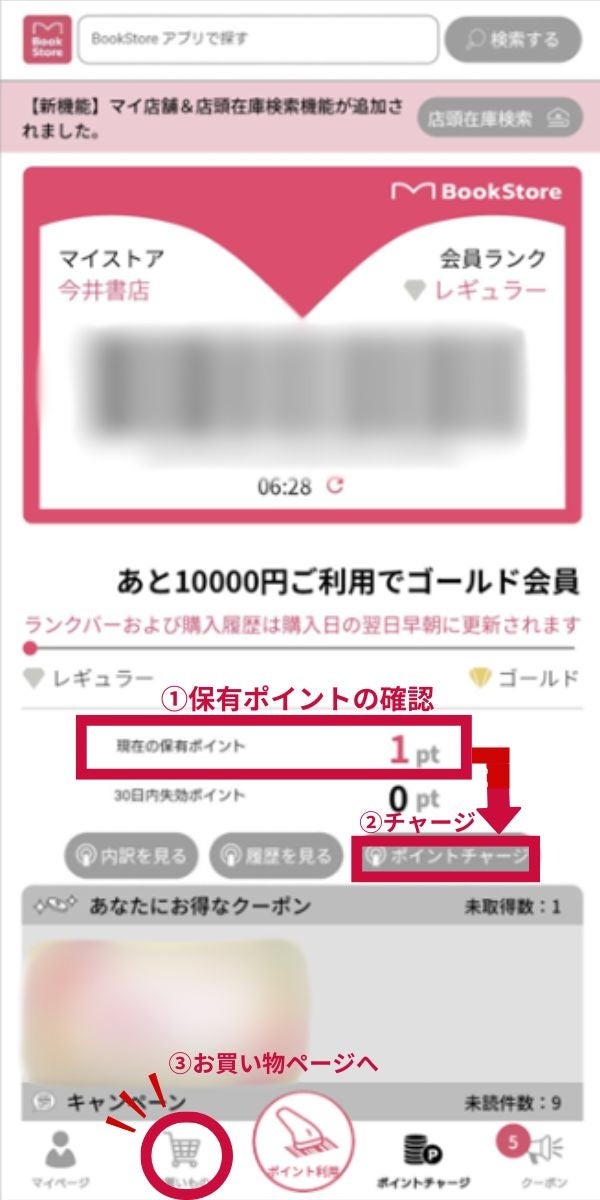 1.BookStoreアプリを開き、ホーム画面の保有ポイントを確認。お買い物ページへ。(※保有ポイントが足りない場合はポイントチャージ)