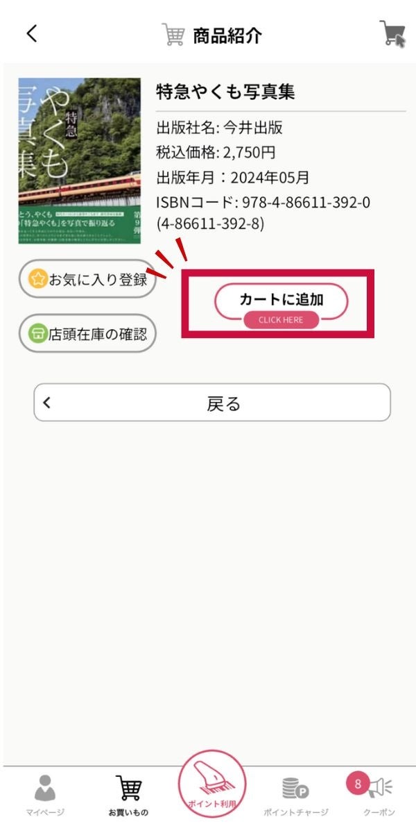 2.お買い物画面の検索窓でお求めの本を検索し、ヒットした商品の一覧からお求めの本をタップします。
