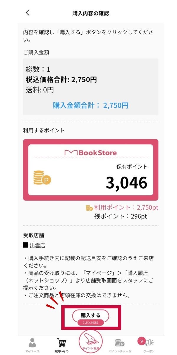 7.購入内容、受取店舗の確認をして「購入する」をタップ。