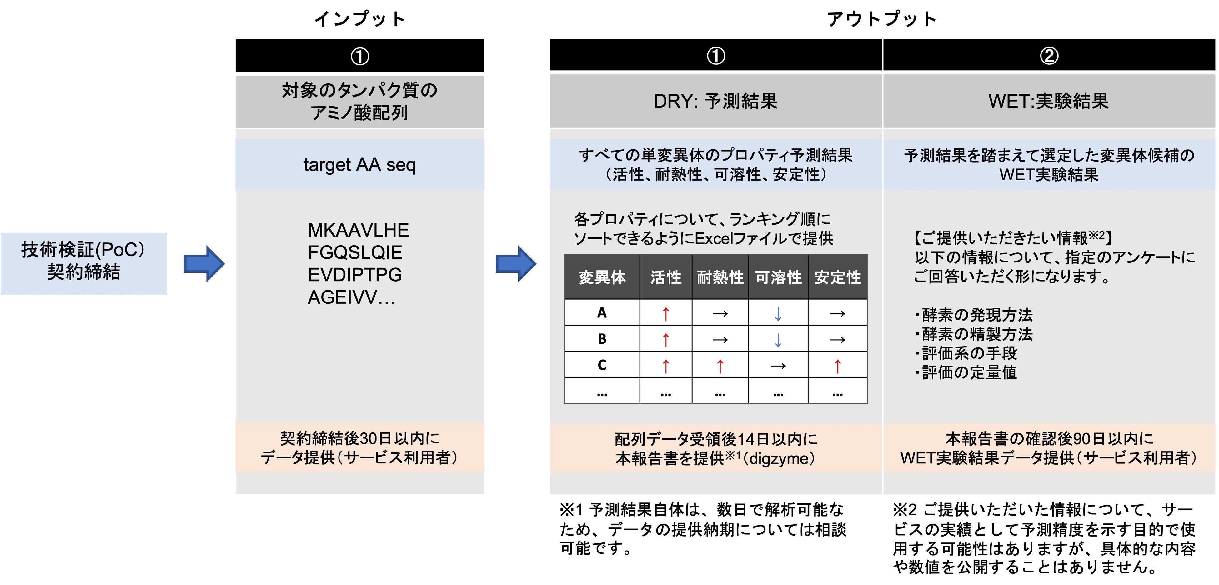 上記のサービスについて、有償PoCによるトライアルを現在実施中です。ご提供いただくアミノ酸配列情報をもとに、変異体のプロパティをdigzyme Spotlightで予測し、その候補の中から実験評価を行っていただくプロセスになります。既に複数社でトライアルを進めており、今回実施するPoCの結果をもとに本サービスのローンチに向けて改良を進めていきます。